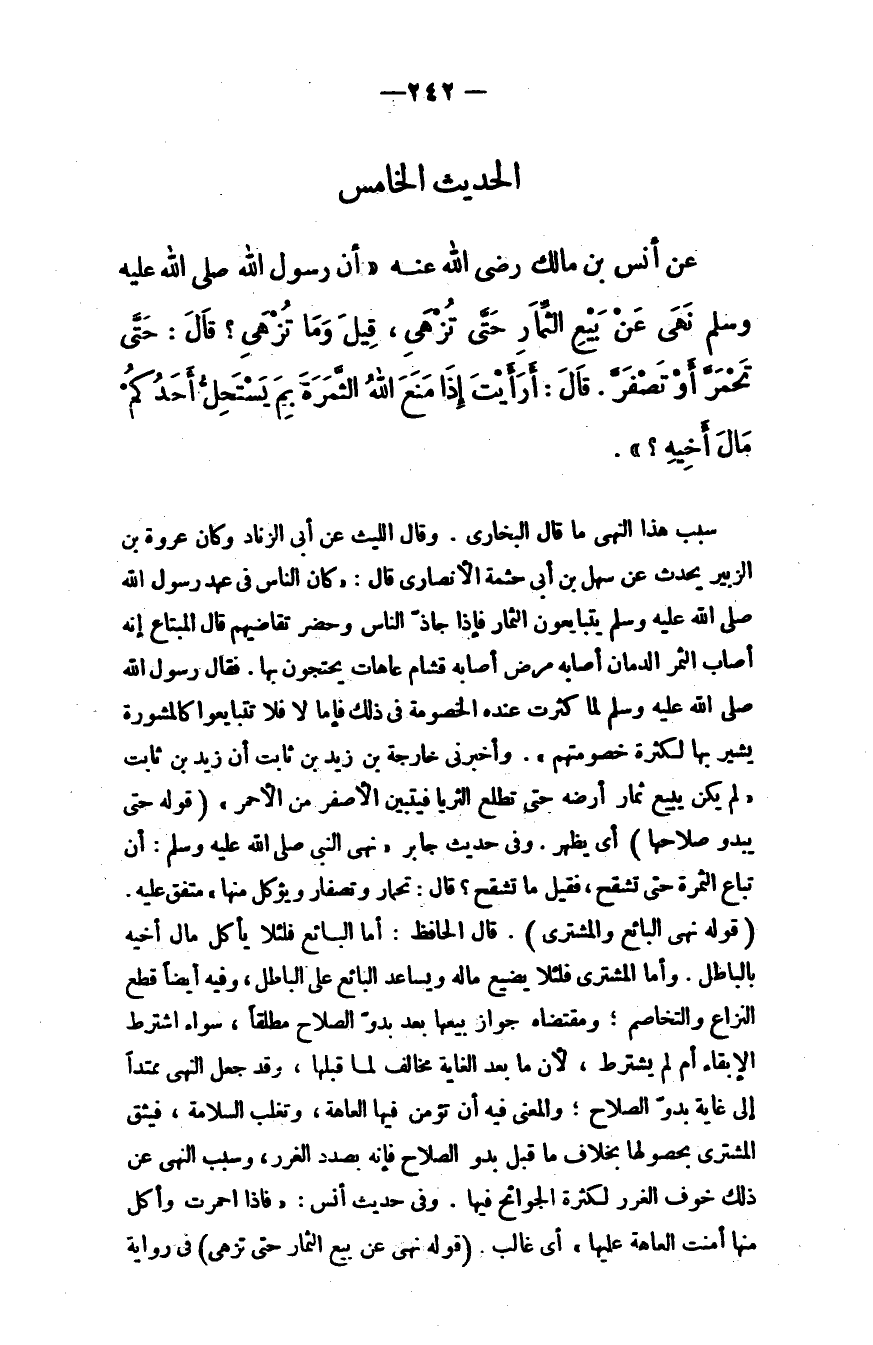 عن أنس بن مالك - رضي الله عنه -: أن رسول الله - صلى الله عليه وسلم - نهى عن بيع الثمار حتى تزهي، قيل: وما تزهي؟ قال: حتى تحمرَّ أو تصفرَّ، قال: أرأيت إذا منع الله الثمرة بِمَ يستحلُّ أحدكم مال أخيه؟
