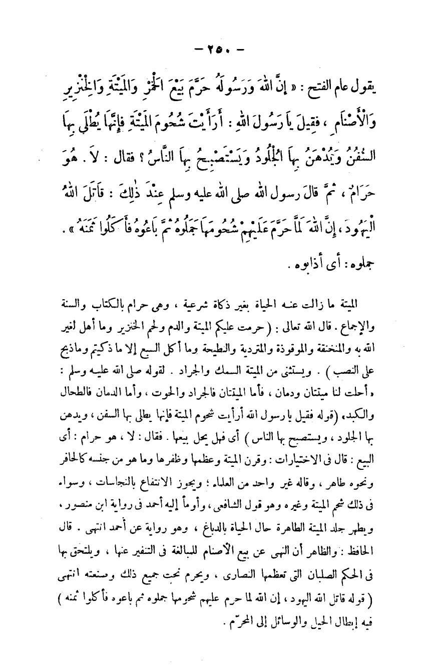 يقول عام الفتح: ((إن الله ورسوله حرَّم بيع الخمر والميتة والخنزير والأصنام، فقيل: يا رسول الله، أرأيت شحوم الميتة فإنها يُطلَى بها السفن ويُدهَن بها الجلود ويستصبح بها الناس؟ فقال: ((لا، هو حرام)) ، ثم قال رسول الله - صلى الله عليه وسلم - عند ذلك: ((قاتَل الله اليهود، إن الله لمَّا حرَّم عليهم شحومها جملوه ثم باعوه فأكلوا ثمنه)) .