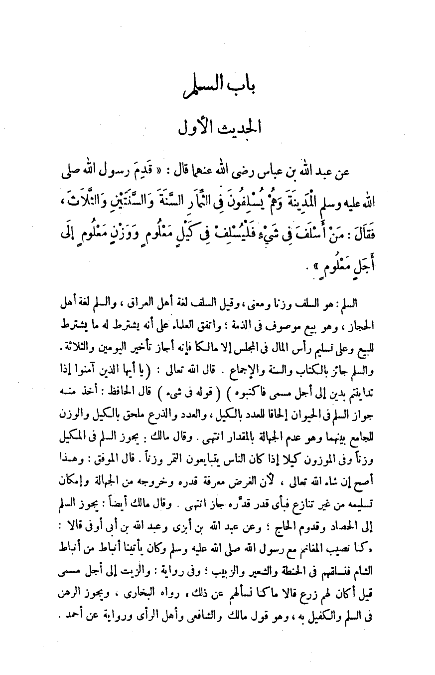 عن عبد الله بن عباس - رضي الله عنهما - قال: "قَدِم رسول الله - صلى الله عليه وسلم - المدينة وهم يسلفون في الثمار السنة والسنتين والثلاث، فقال: ((مَن أسلف في شيء فليسلف في كيلٍ معلومٍ ووزنٍ معلومٍ إلى أجلٍ معلومٍ)) .
