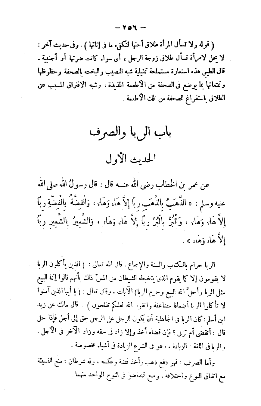عن عمر بن الخطاب - رضي الله عنه - قال: قال رسول الله - صلى الله عليه وسلم -: ((الذهب بالذهب ربًا إلا هاء وهاء، والفضة بالفضة ربًا إلا هاء وهاء، والبُرُّ بالبُرِّ ربًا إلا هاء وهاء، والشعير بالشعير ربًا إلا هاء وهاء)) .