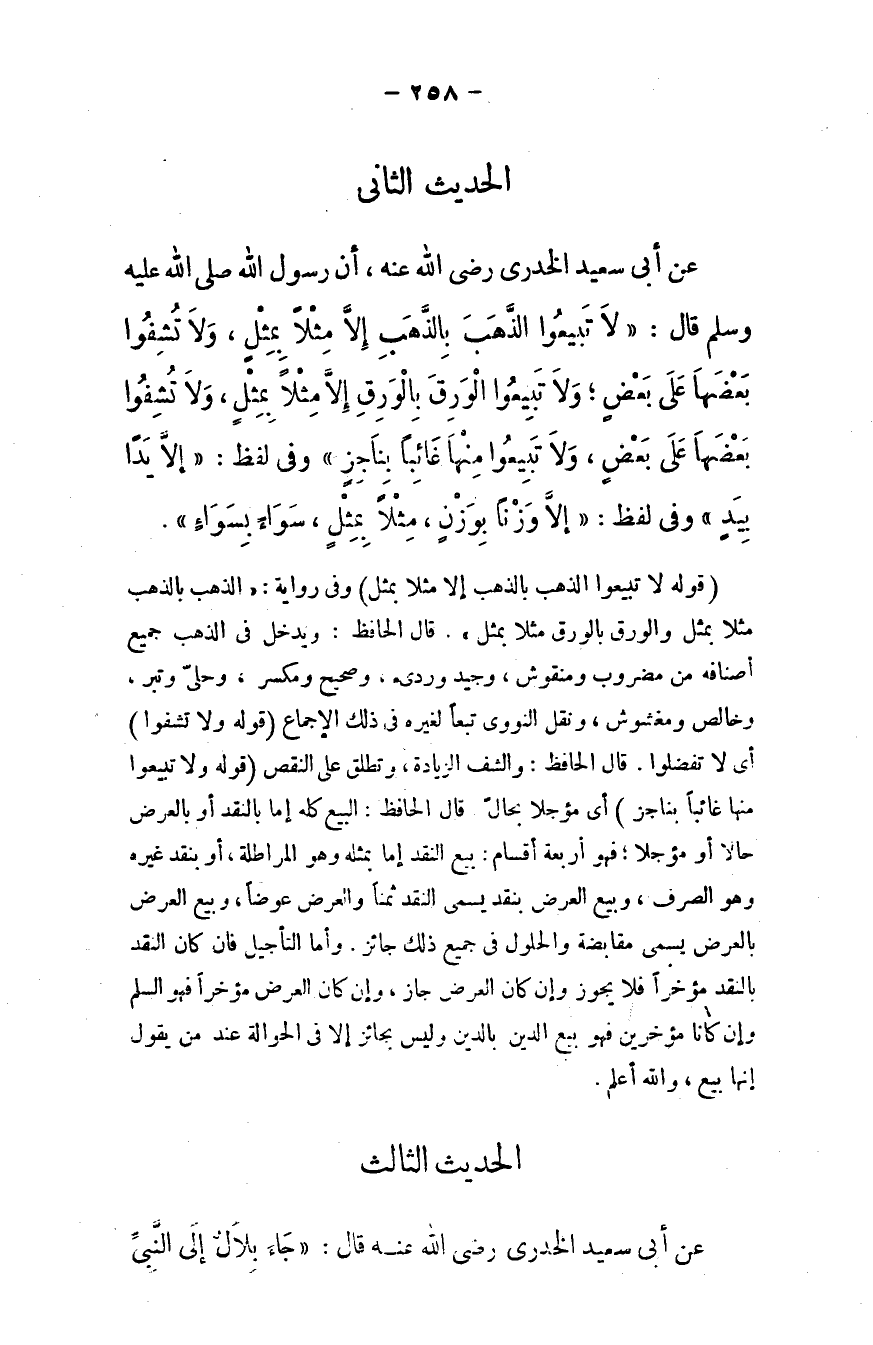 عن أبي سعيد الخدري - رضي الله عنه - أن رسول الله - صلى الله عليه وسلم - قال: ((لا تبيعوا الذهب بالذهب إلا مثلاً بمثل، ولا تشفوا بعضها على بعض، ولا تبيعوا الورق