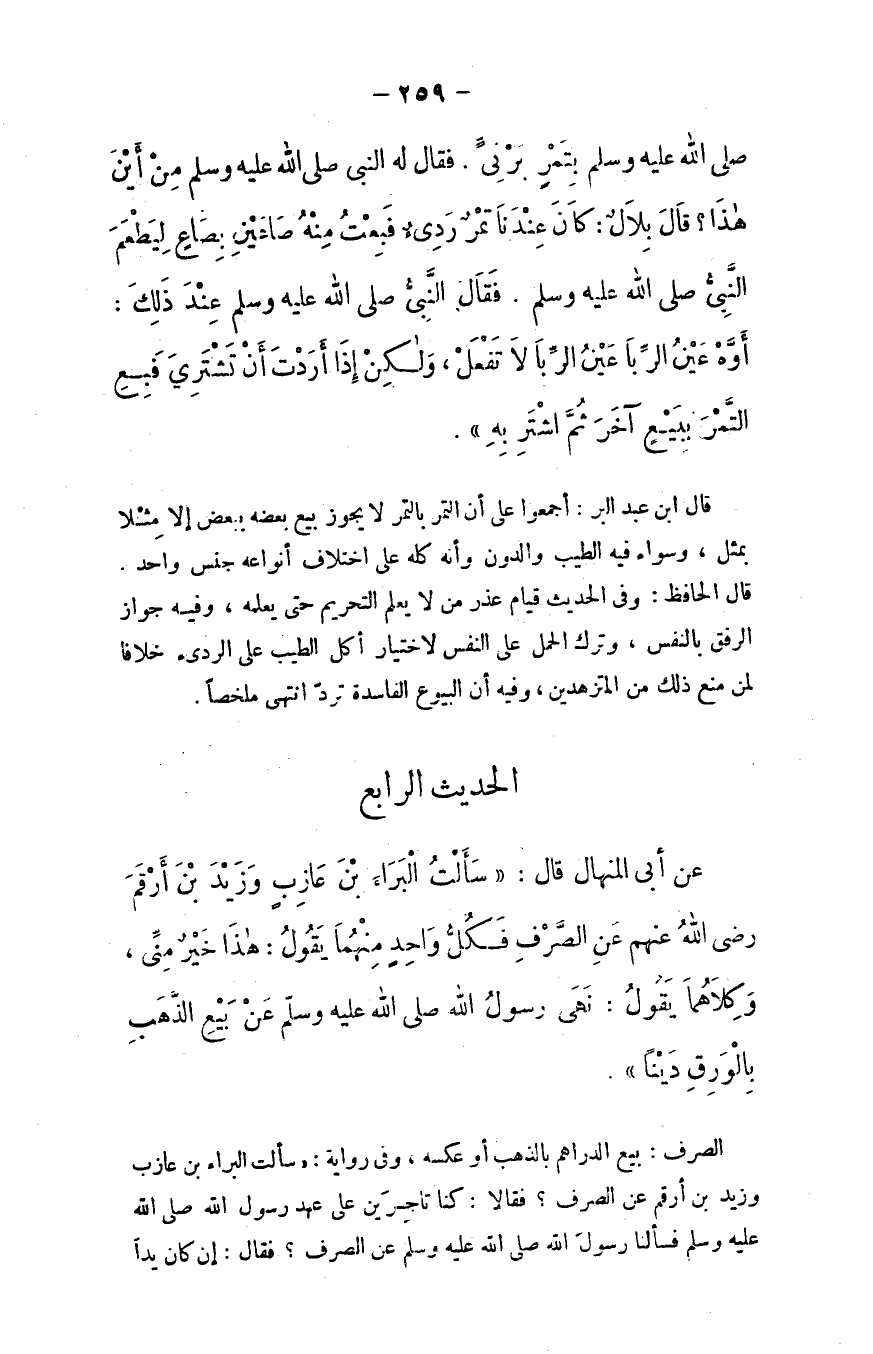 الصرف: بيع الدراهم بالذهب أو عكسه، وفي رواية: "سألت البراء بن عازب وزيد بن أرقم عن الصرف؟ فقالا: كُنَّا تاجرين على عهد رسول الله - صلى الله عليه وسلم - فسألنا رسول الله - صلى الله عليه وسلم - عن الصرف؟ فقال: ((إن كان يدًا