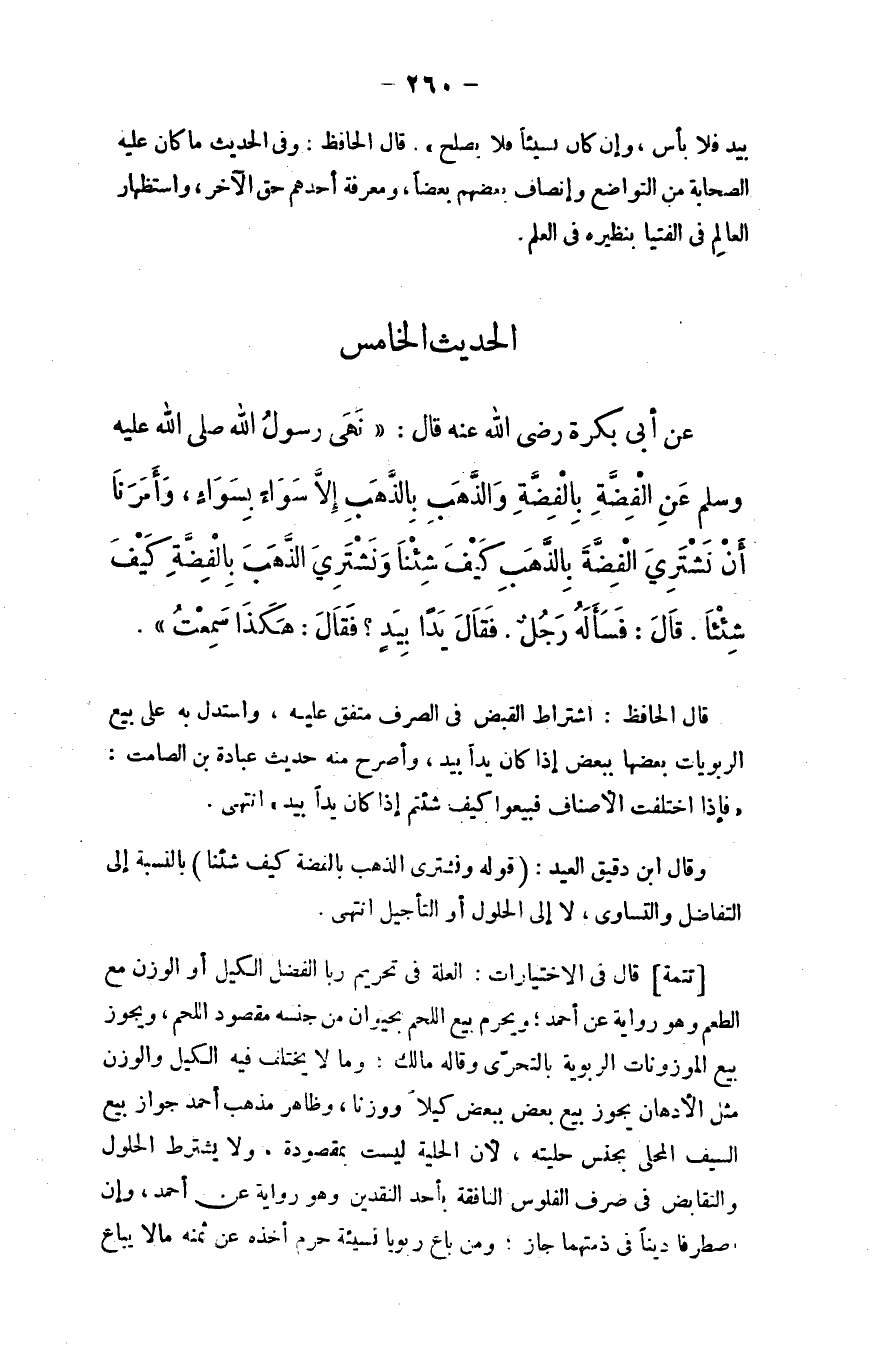عن أبي بكرة - رضي الله عنه - قال: "نهى رسول الله - صلى الله عليه وسلم - عن الفضة بالفضة والذهب بالذهب إلا سواءً بسواءٍ، وأمرنا أن نشتري الفضة بالذهب كيف شئنا، ونشتري الذهب بالفضة كيف شئنا، قال: فسأله رجلٌ فقال: يدًا بيدٍ؟ فقال: هكذا سمعت".