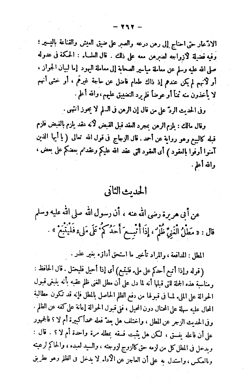 وفي الحدث الزجر عن المطل، واختُلِف هل يُعَدُّ فعله عمدًا كبيرة أم لا؟ فالجمهور على أن فاعله يفسق، لكن هل يثبت فسقه بمطله مرَّة واحدة أم لا؟ قال: ويدخل في المطل كلُّ مَن لزمه حقٌّ؛ كالزوج لزوجته، والسيد لعبده، والحاكم لرعيته وبالعكس، واستدلَّ به على أن العاجز عن الأداء لا يدخل في الظلم وهو بطريق
