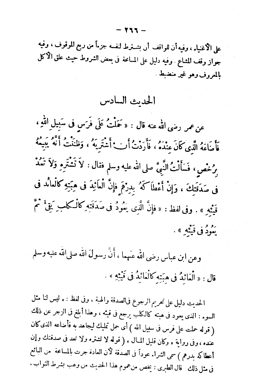عن عمر - رضي الله عنه - قال: "حملت على فرس في سبيل الله، فأضاعه الذي كان عنده، فأردت أن أشتريه، وظننت أنه يبيعه برخص، فسألت النبي - صلى الله عليه وسلم - فقال: ((لا تشترِه ولا تَعُد في صدقتك، وإن أعطاكه بدرهم فإن العائد في هبته كالعائد في قيئه)) ، وفي لفظ: ((فإن الذي يعود في صدقته كالكلب يقيء ثم يعود في قيئه)) .