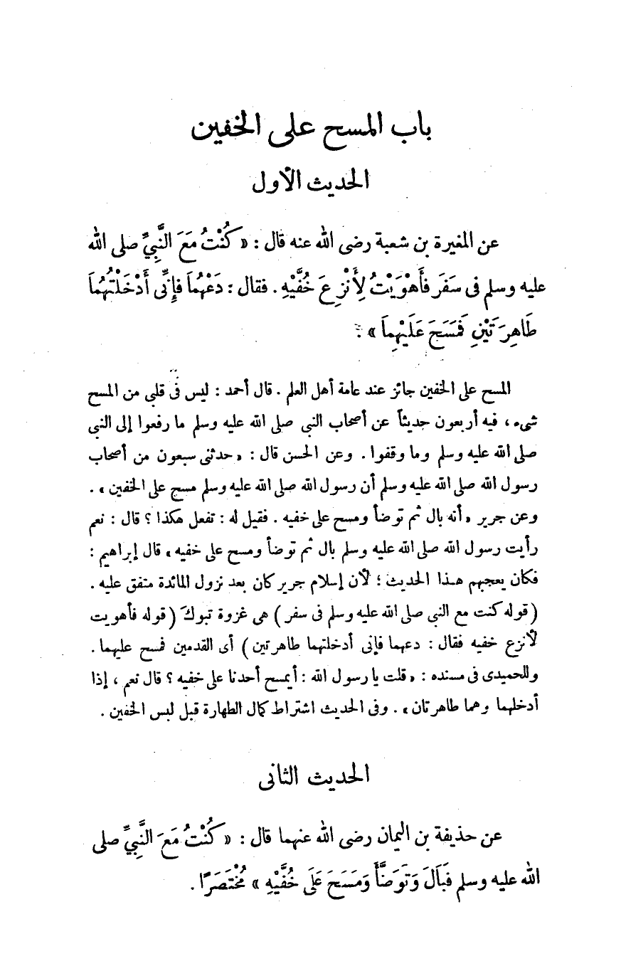 المسح على الخفين جائز عند عامة أهل العلم. قال أحمد: ليس في قلبي من المسح شيء، فيه أربعون حديثا عن أصحاب النبي - صلى الله عليه وسلم - ما رفعوا إلى النبي - صلى الله عليه وسلم - وما وقفوا. وعن الحسن قال: ((حدثني سبعون من أصحاب رسول الله - صلى الله عليه وسلم - أن رسول الله - صلى الله عليه وسلم - مسح على الخفين)) .