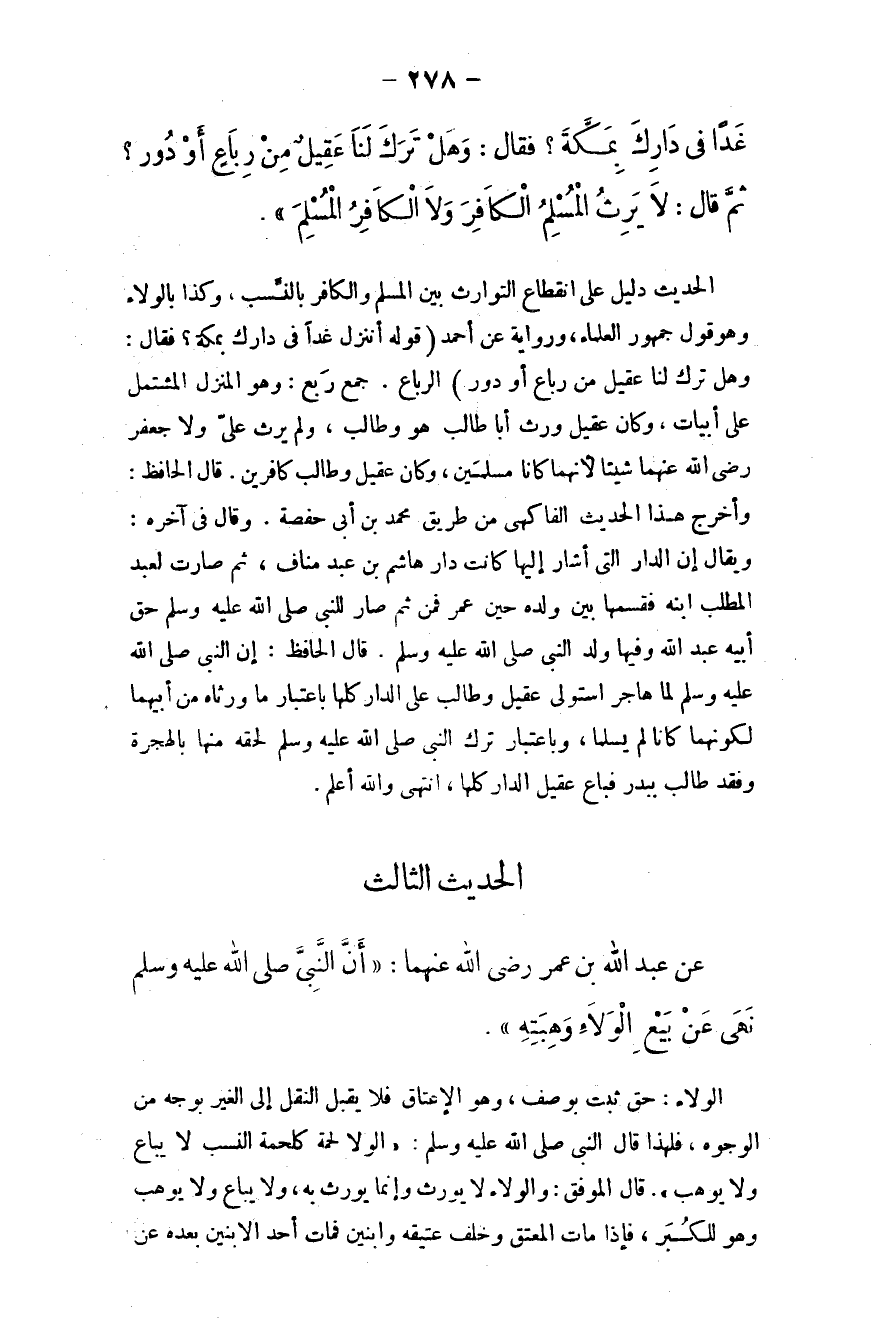 غدًا في دارك بمكة؟ فقال: ((وهل ترك لنا عقيل من رباعٍ أو دور؟)) ، ثم قال: ((لا يرث المسلم الكافر ولا الكافر المسلم)) .