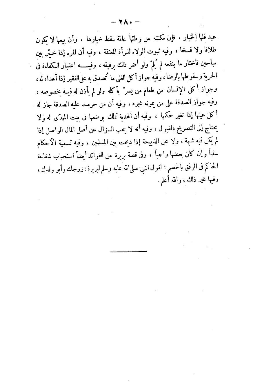 يمونه غيره، وفيه أن مَن حَرُمت عليه الصدقة جاز له أكل عينها إذا تغيَّر حكمها، وفيه أن الهدية تُمَلَّك بوضعها في بيت المهدي له ولا يحتاج إلى التصريح بالقبول، وفيه أنه لا يجب السؤال عن أصل المال الواصل إذا لم يكن فيه شبهة، ولا عن الذبيحة إذا ذُبِحت بين المسلمين، وفيه تسمية الأحكام سننًا وإن كان بعضها واجبًا، وفي قصة بريرة من الفوائد أيضًا استحباب شفاعة الحاكم في الرفق بالخصم؛ لقول النبي - صلى الله عليه وسلم - لبريرة: ((زوجك وأبو ولدك)) ، وفيها غير ذلك، والله أعلم.