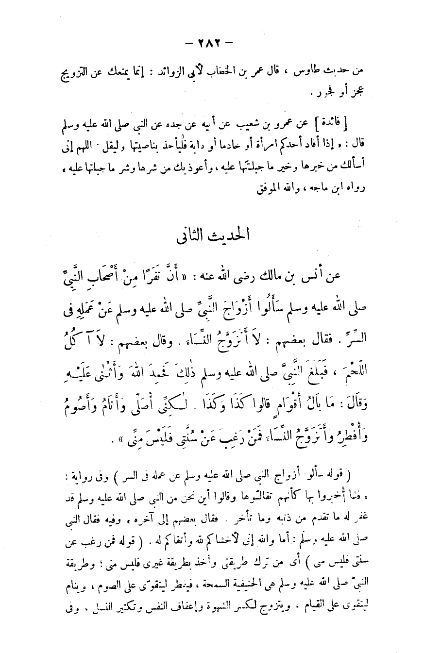 عن أنس بن مالك - رضي الله عنه -: "أن نفرًا من أصحاب النبي - صلى الله عليه وسلم - سألوا أزواج النبي - صلى الله عليه وسلم - عن عمله في السر، فقال بعضهم: لا أتزوج النساء، وقال بعضهم: لا آكل اللحم، فبلغ النبي - صلى الله عليه وسلم - ذلك فحمد الله وأثنى عليه وقال: ((ما بال أقوام قالوا كذا وكذا، لكني أصلي وأنام، وأصوم وأفطر، وأتزوج النساء، فمَن رغب عن سنتي فليس مِنِّي)) .