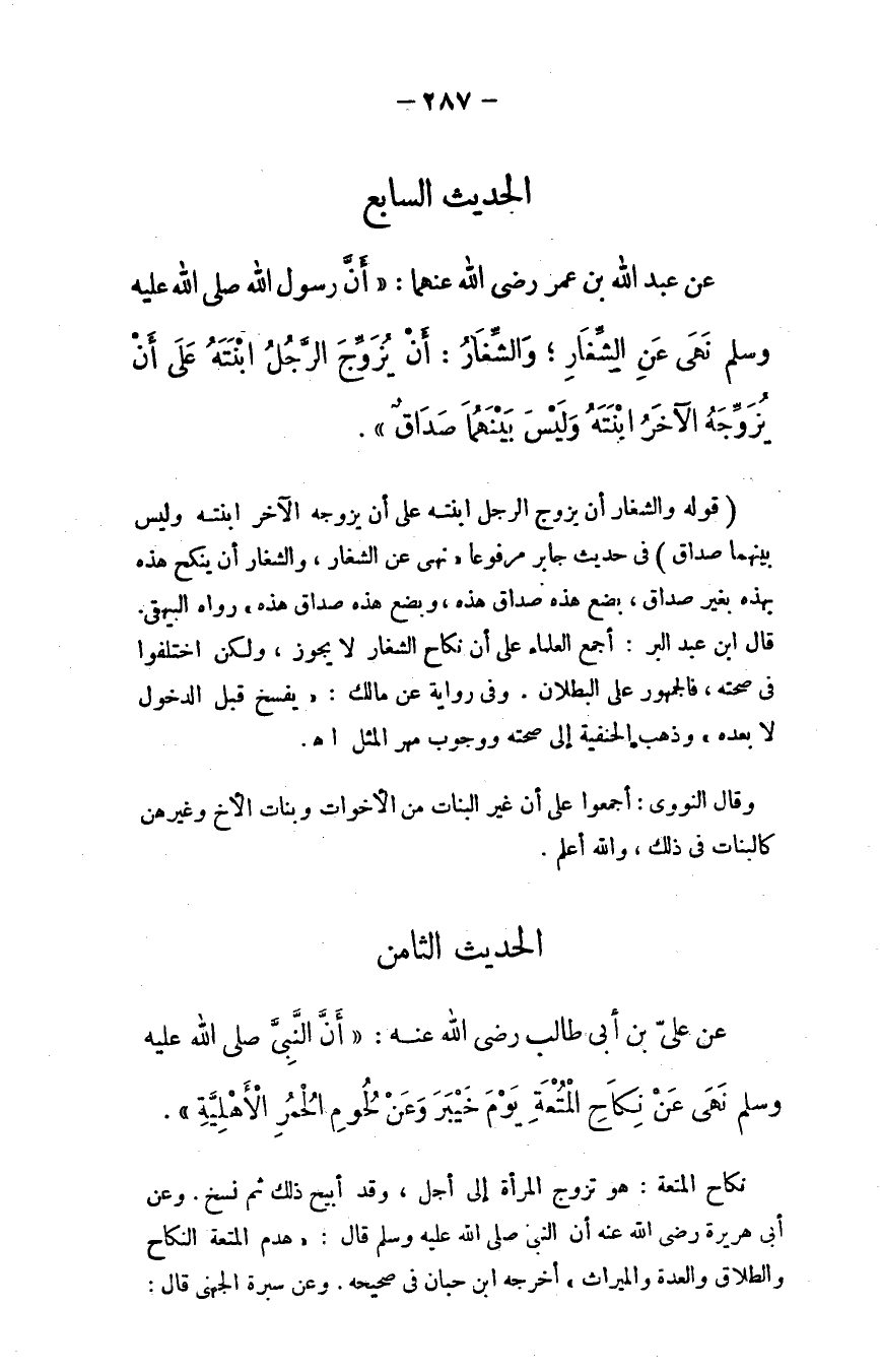 عن عبد الله بن عمر - رضي الله عنهما -: "أن رسول الله - صلى الله عليه وسلم - نهى عن الشغار"؛ والشغار: أن يزوج الرجل ابنته على أن يزوجه الآخر ابنته وليس بينهما صداق.