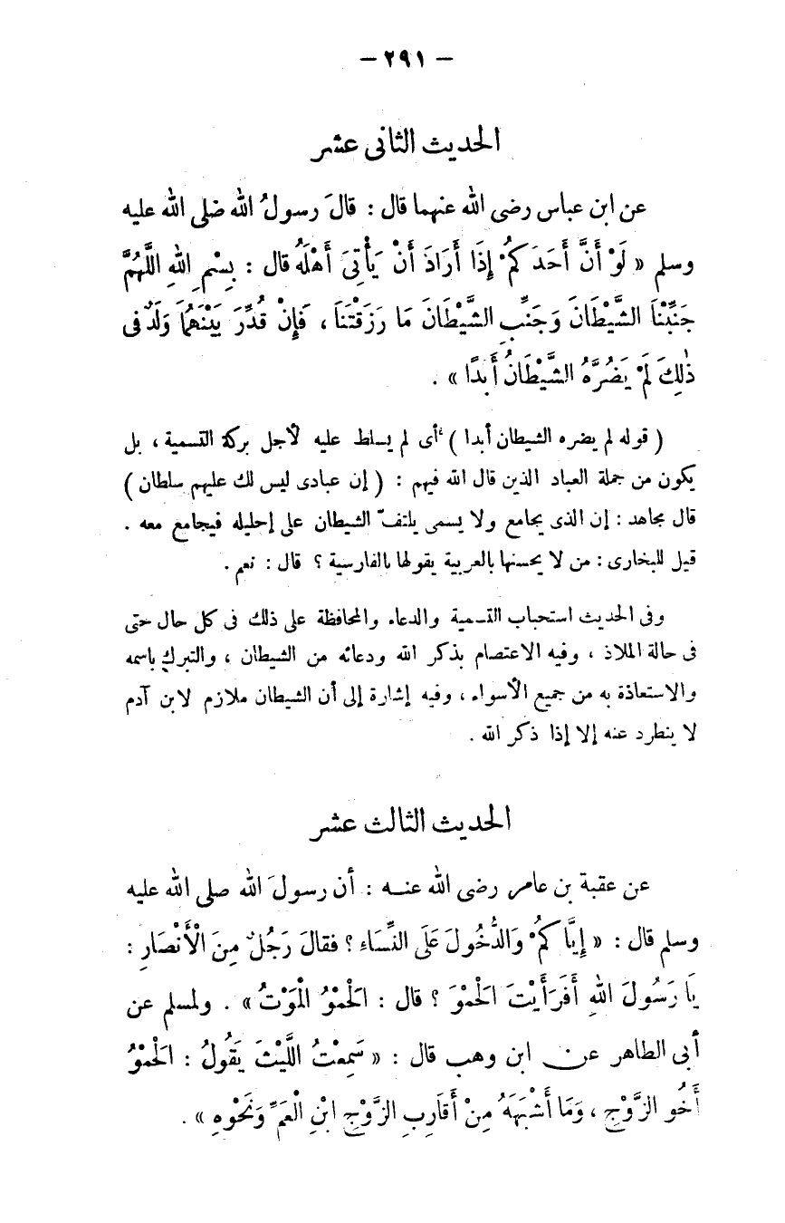 عن ابن عباس - رضي الله عنهما - قال: قال رسول الله - صلى الله عليه وسلم -: ((لو أن أحدكم إذا أراد أن يأتي أهله قال: بسم الله اللهم جنِّبنا الشيطان وجنِّب الشيطان ما رزقتنا، فإن قُدِّر بينهما ولد في ذلك لم يضره الشيطان أبدًا)) .