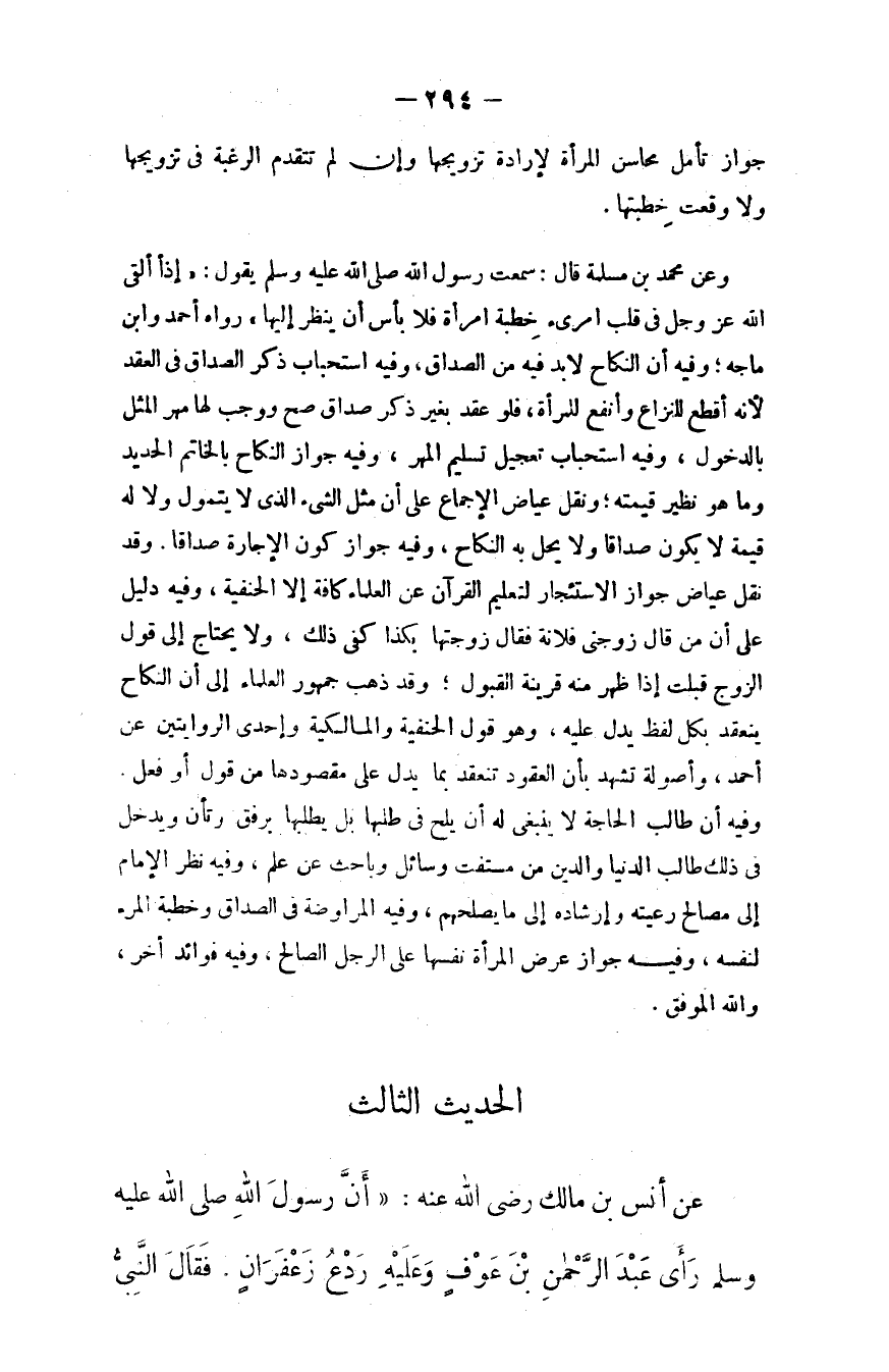 وفيه أن طالب الحاجة ينبغي عليه ألاَّ يلحَّ في طلبها، بل يطلبها برفق وتأنٍّ ويدخل في ذلك طالب الدنيا والدين من مستفتٍ وسائل وباحث عن علم، وفيه نظر الإمام على مصالح رعيَّته وإرشاده إلى ما يصلحهم، وفيه المراوضة في الصداق