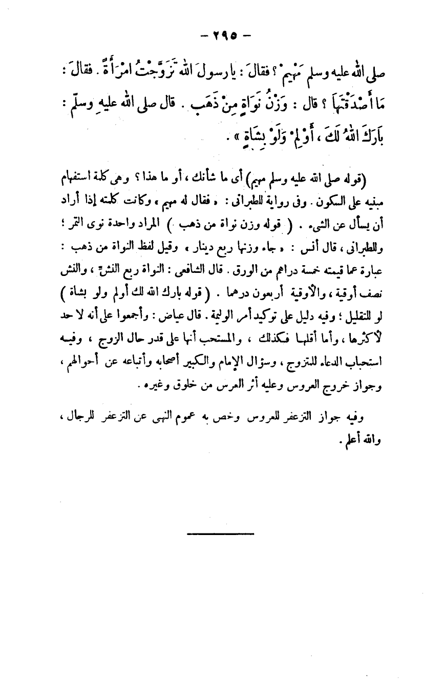 - صلى الله عليه وسلم -: مَهْيَم؟ فقال: يا رسول الله، تزوجت امرأة، فقال: ((ما أصدقتها؟)) ، قال: وزن نواة من ذهب، قال: ((بارك الله لك، أَوْلِم ولو بشاة)) .