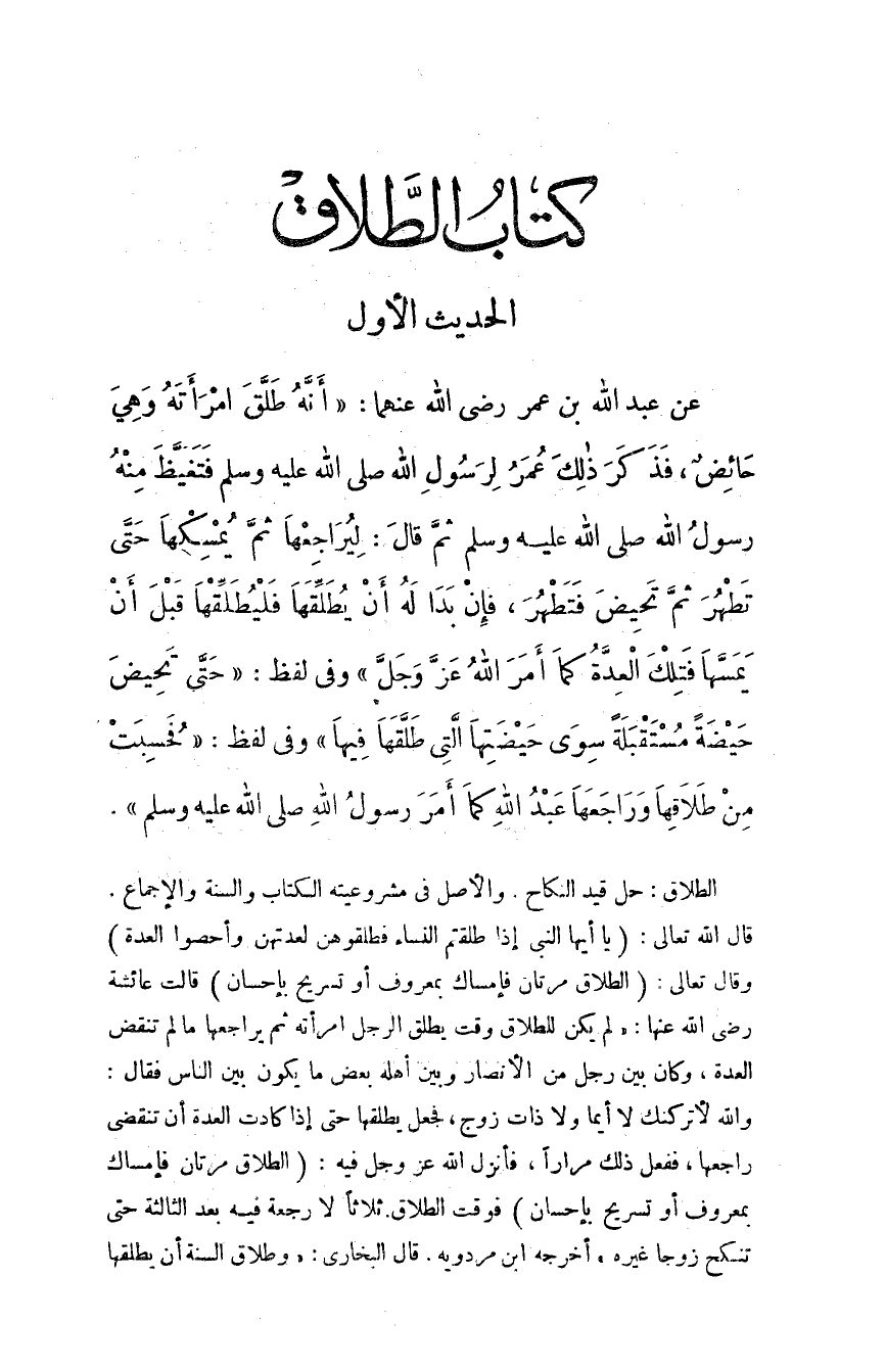 (الطلاق) : حل قيد النكاح، والأصل في مشروعيته الكتاب والسنة والإجماع؛ قال الله - تعالى -: {يَا أَيُّهَا النَّبِيُّ إِذَا طَلَّقْتُمُ النِّسَاءَ فَطَلِّقُوهُنَّ لِعِدَّتِهِنَّ وَأَحْصُوا الْعِدَّةَ} [الطلاق: 1] ، وقال - تعالى -: {الطَّلاَقُ مَرَّتَانِ فَإِمْسَاكٌ بِمَعْرُوفٍ أَوْ تَسْرِيحٌ بِإِحْسَانٍ} [البقرة: 229] .