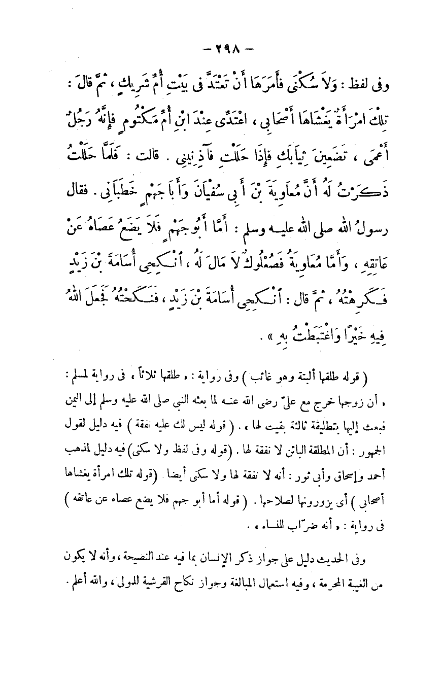 وفي لفظ: ((ولا سكنى)) ، فأمرها أن تعتدَّ في بيت أم شريك، ثم قال: ((تلك امرأة يغشاها أصحابي، اعتدِّي عند ابن أم مكتوم فإنه رجل أعمى، تضعين ثيابك فإذا حللت فآذنيني)) ، قالت: فلمَّا حللت ذكرت له أن معاوية بن أبي سفيان وأبا جهم خطباني، فقال رسول الله - صلى الله عليه وسلم -: ((أمَّا أبو جهم فلا يضع عصاه عن عاتقه، وأمَّا معاوية فصعلوك لا مال له، انكحي أسامة بن زيد)) ، فكرهته، ثم قال: ((انكحي أسامة بن زيد)) ، فنكحته فجعل الله فيه خيرًا واغتبطت به.