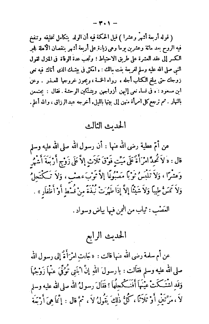 عن أم سلمة - رضي الله عنها - قالت: "جاءت امرأة إلى رسول الله - صلى الله عليه وسلم - فقالت: يا رسول الله، إن ابنتي توفي عنها زوجها وقد اشتكت عينها، أفنكحلها؟ فقال رسول الله - صلى الله عليه وسلم -: ((لا)) ، مرتين أو ثلاثًا، كل ذلك يقول: ((لا)) ، ثم قال: ((إنما هي أربعة