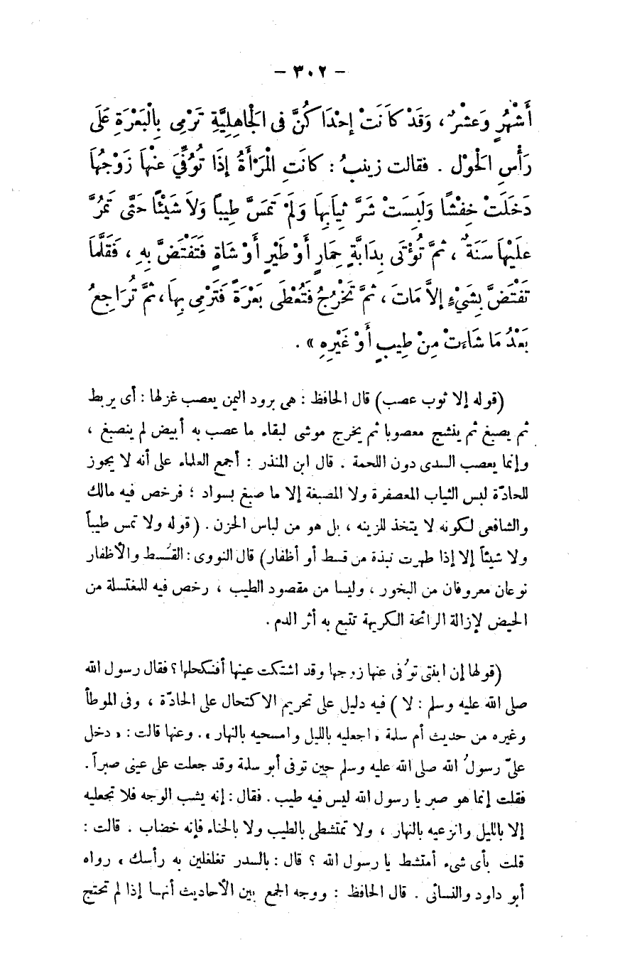 قال ابن المنذر: أجمع العلماء على أنه لا يجوز للحادَّة لبس الثياب المعصفرة ولا المصبغة إلاَّ ما صُبِغ بسواد، فرخَّص فيه مالك والشافعي لكونه لا يتَّخذ للزينة، بل هو من لباس الحزن.