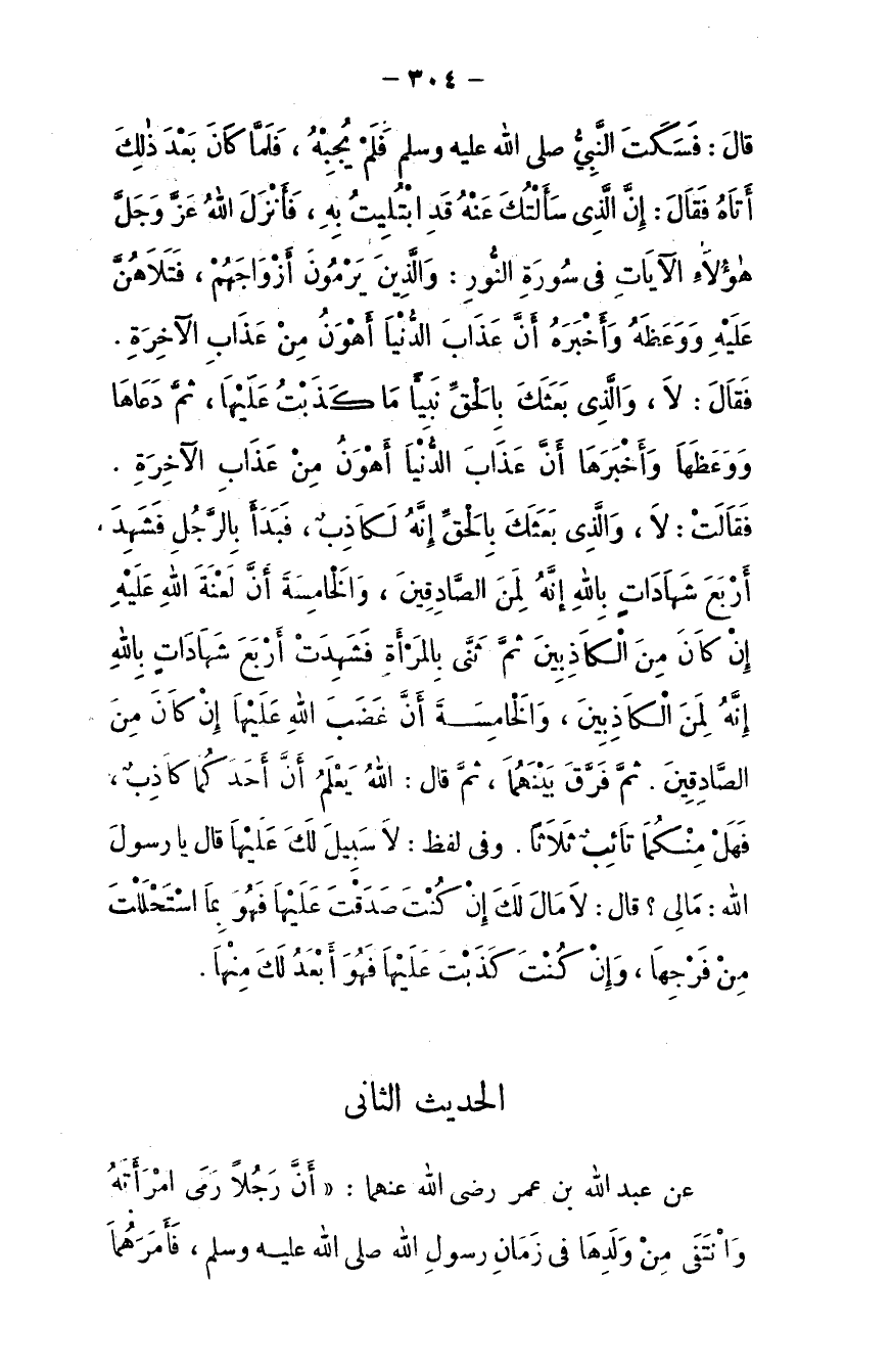 قال: فسكت النبي - صلى الله عليه وسلم - فلم يجبه، فلمَّا كان بعد ذلك أتاه فقال: إن الذي سألتك عنه قد ابتليت به، فأنزل الله - عزَّ وجلَّ - هؤلاء الآيات في سورة النور: {وَالَّذِينَ يَرْمُونَ أَزْوَاجَهُمْ ... } [النور: 6] ، فتلاهن عليه ووعظه، وأخبره أن عذاب الدنيا أَهْوَن من عذاب الآخرة، فقال: لا، والذي بعثك بالحق نبيًّا ما كذبت عليها، ثم دعاها ووعظها، وأخبرها أن عذاب الدنيا أَهْوَن من عذاب الآخرة، فقالت: لا، والذي بعثك بالحق إنه لكاذب، فبدأ بالرجل فشهد أربع شهادات بالله إنه لمن الصادقين، والخامسة أن لعنة الله عليه إن كان من الكاذبين ثم ثنَّى بالمرأة فشهدت أربع شهادات بالله إنه لمن الكاذبين، والخامسة أن غضب الله عليه إن كان من الصادقين، ثم فرَّق بينهما، ثم قال: ((الله يعلم أن أحدكما كاذب، فهل منكما تائب)) ثلاثًا، وفي لفظ: ((لا سبيل لك عليها)) ، قال: يا رسول الله، مالي؟ قال: ((لا مال لك إن كنت صدتَ عليها فهو بما استحللت من فرجها، وإن كنتَ كذبتَ عليها فهو أبعد لك منها)) .