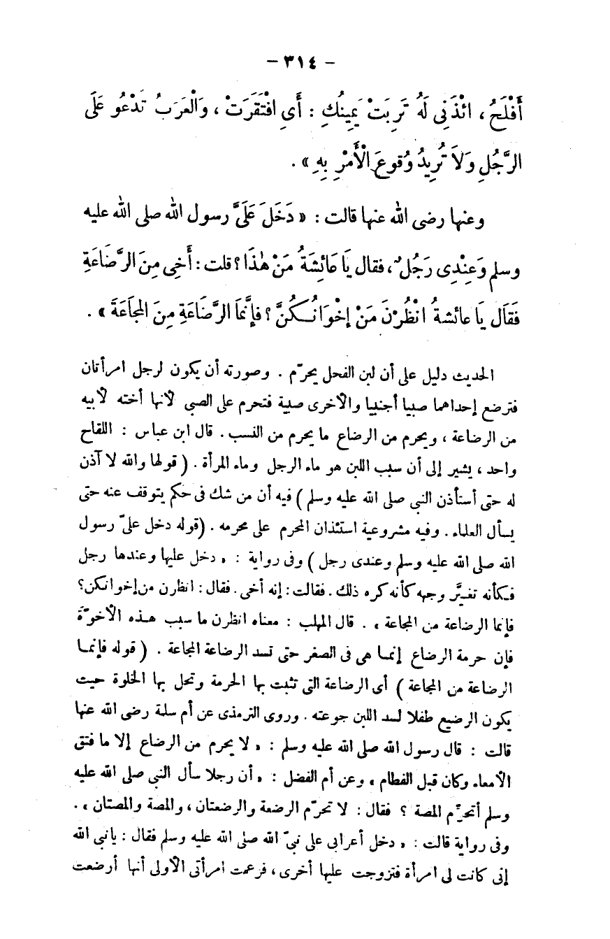 قولها: "دخل عليَّ رسول الله - صلى الله عليه وسلم - وعندي رجل"، وفي رواية: "دخل عليها وعندها رجل فكأنه تغيَّر وجهه كأنه كره ذلك، فقالت: إنه أخي، فقال: ((انظرن مَن إخوانكن)) ، فإنما الرضاعة من المجاعة)) ، قال المهلب: معناه: انظر ما سبب هذه الأخوة فإن حرمة الرضاع إنما هي في الصغر حتى تسدَّ الرضاعة المجاعة.