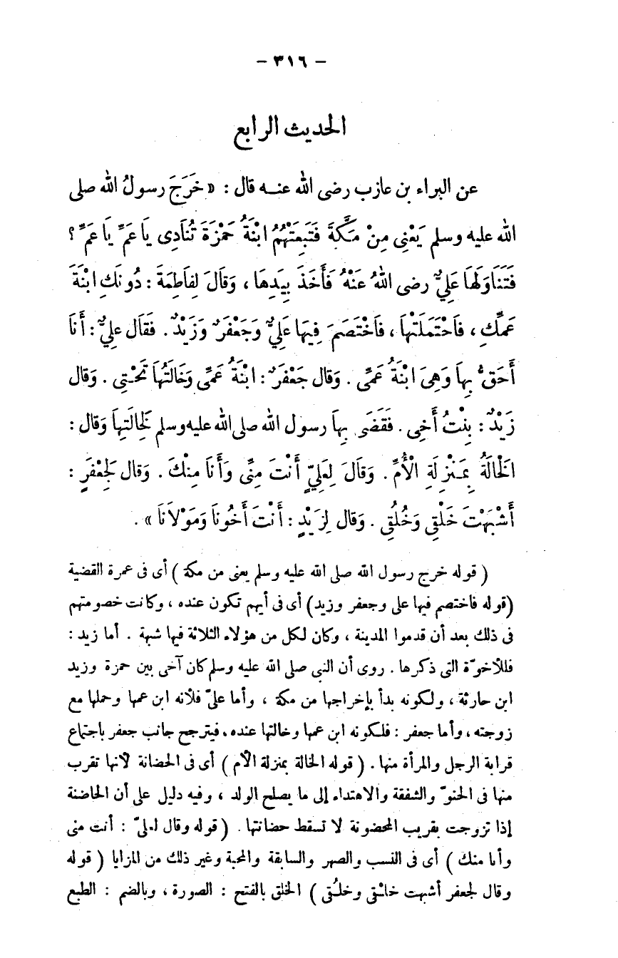 عن البراء بن عازب - رضي الله عنه - قال: "خرج رسول الله - صلى الله عليه وسلم - يعني: من مكة - فتبعتهم ابنة حمزة تنادي: يا عمِّ، يا عمِّ، فتناولها علي - رضي الله عنه - فأخذ بيدها، وقال لفاطمة: دونك ابنة عمك، فاحتملتها، فاختصم فيها علي وجعفر وزيد، فقال علي: أنا أحقُّ بها وهي ابنة عمي، وقال جعفر: ابنة عمِّي وخالتها تحتي، وقال زيد: بنت أخي، فقضى بها رسول الله - صلى الله عليه وسلم - لخالتها وقال: ((الخالة بمنزلة الأم)) ، وقال لعلي: ((أنت مِنِّي وأنا منك)) ، وقال لجعفر: ((أشبهت خَلْقِي وخُلُقِي)) ، وقال لزيد: ((أنت أخونا ومولانا)) .