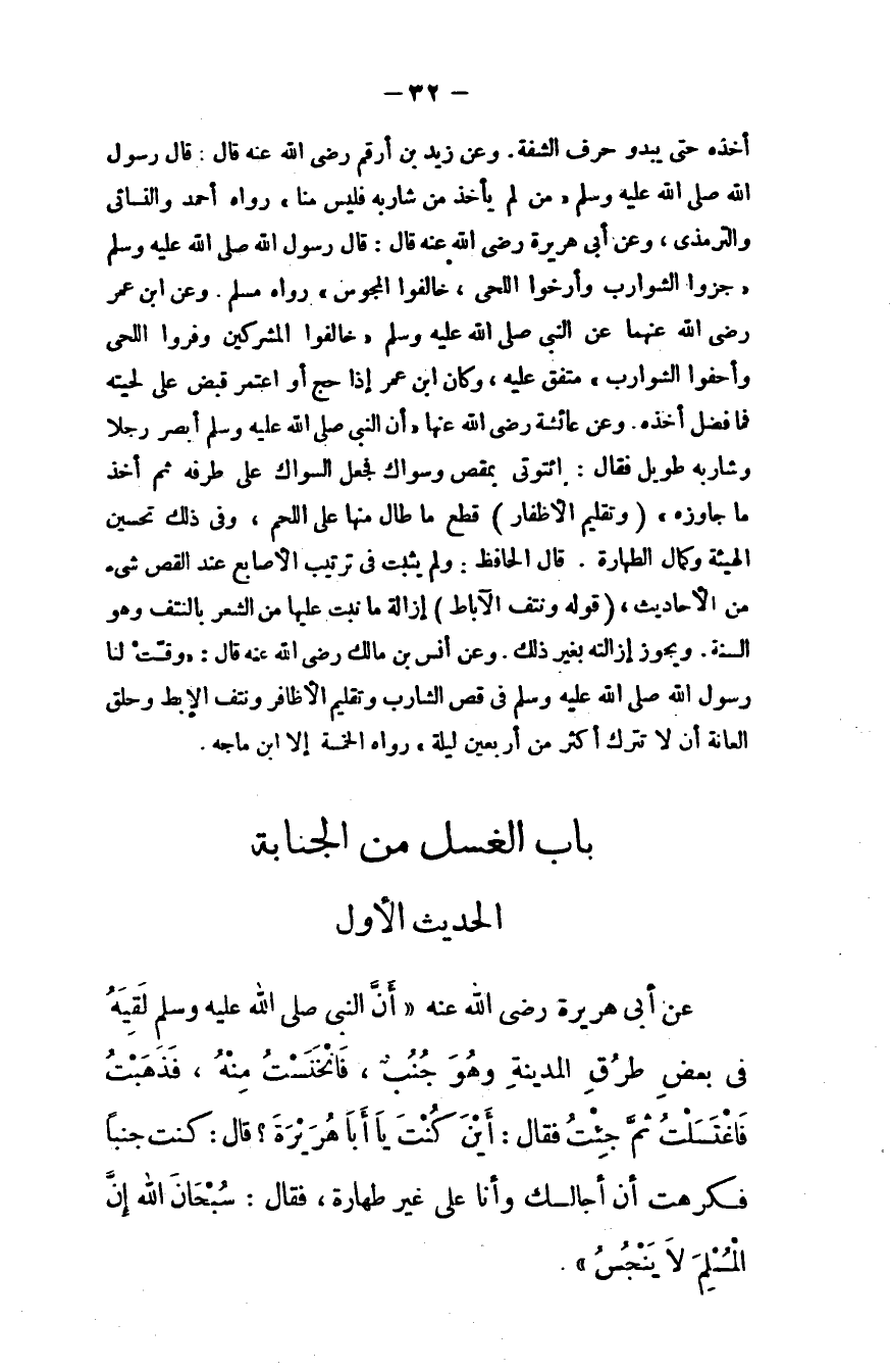 عن أبي هريرة - رضي الله عنه - أن النبي - صلى الله عليه وسلم - لقيه في بعض طرق المدينة وهو جنب: "فانخنست منه، فذهبت فاغتسلت ثم جئت فقال: ((أين كنت يا أبا هريرة؟)) ، قال: كنت جنبًا، فكرهت أن أجالسك وأنا على غير طهارة، فقال: ((سبحان الله، إن المسلم لا ينجس)) .