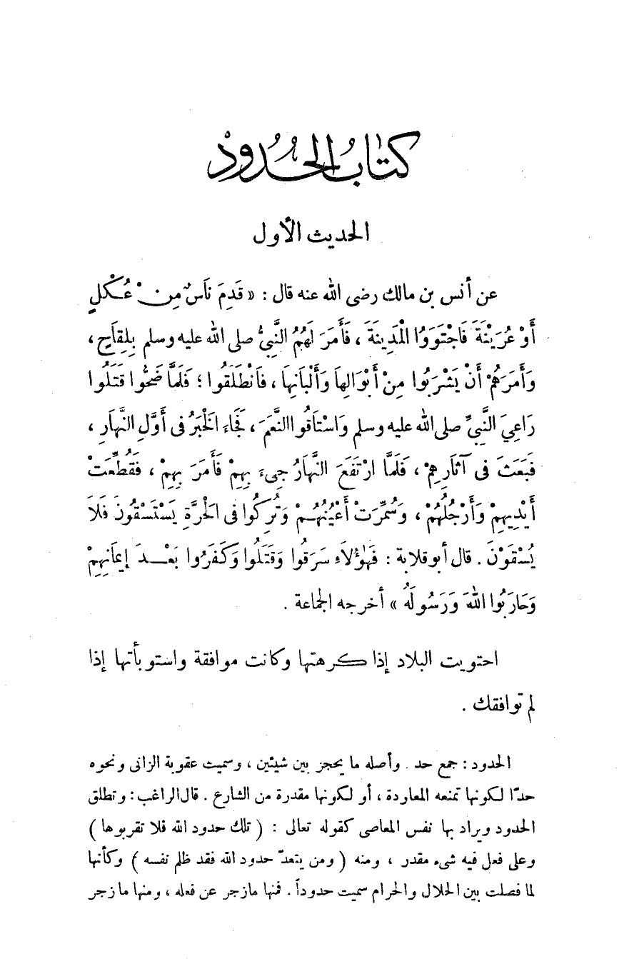 عن أنس بن مالك - رضي الله عنه - قال: "قدم ناس من عُكْلٍ أو عُرَينة فاجتووا المدينة، فأمر لهم النبي - صلى الله عليه وسلم - بلقاحٍ، وأمَرَهم أن يشربوا من أبوالها وألبانها، فانطلقوا، فلمَّا ضحُّوا قتلوا راعي النبي - صلى الله عليه وسلم - واستاقوا النعم، فجاء الخبر في أوَّل النهار، فبعث في آثارهم، فلمَّا ارتفع النهار جيء بهم فأمر بهم، فقطعت أيديهم وأرجلهم، وسمرت أعينهم وتركوا في الحرَّة يستسقون فلا يسقون، قال أبو قلابة: فهؤلاء سرقوا وقتلوا وكفروا بعد إيمانهم وحاربوا الله ورسوله"؛ أخرجه الجماعة.