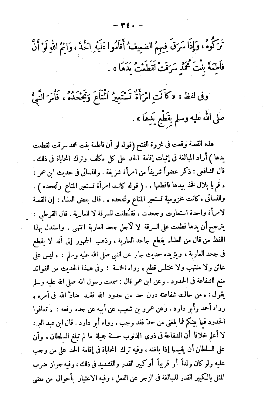 وعن عمرو بن شعيب عن أبيه عن جدِّه رفعه: ((تعافوا الحدود فيما بينكم، فما بلغني من حدٍّ وجب)) ؛ رواه أبو داود، قال ابن عبد البر: لا أعلم خلافًا أن الشفاعة في ذوي الذنوب حسنة جميلة ما لم تبلغ السلطان، وأن على السلطان أن يقيمها إذا بلغته، وفيه ترك المحاباة في إقامة الحد على مَن وجب عليه، ولو كان ولدًا أو قريبًا أو كبير القدر والتشديد في ذلك، وفيه جواز ضرب المثل بالكبير القدر للمبالغة في الزجر عن الفعل، وفيه الاعتبار بأحوال مَن مضى