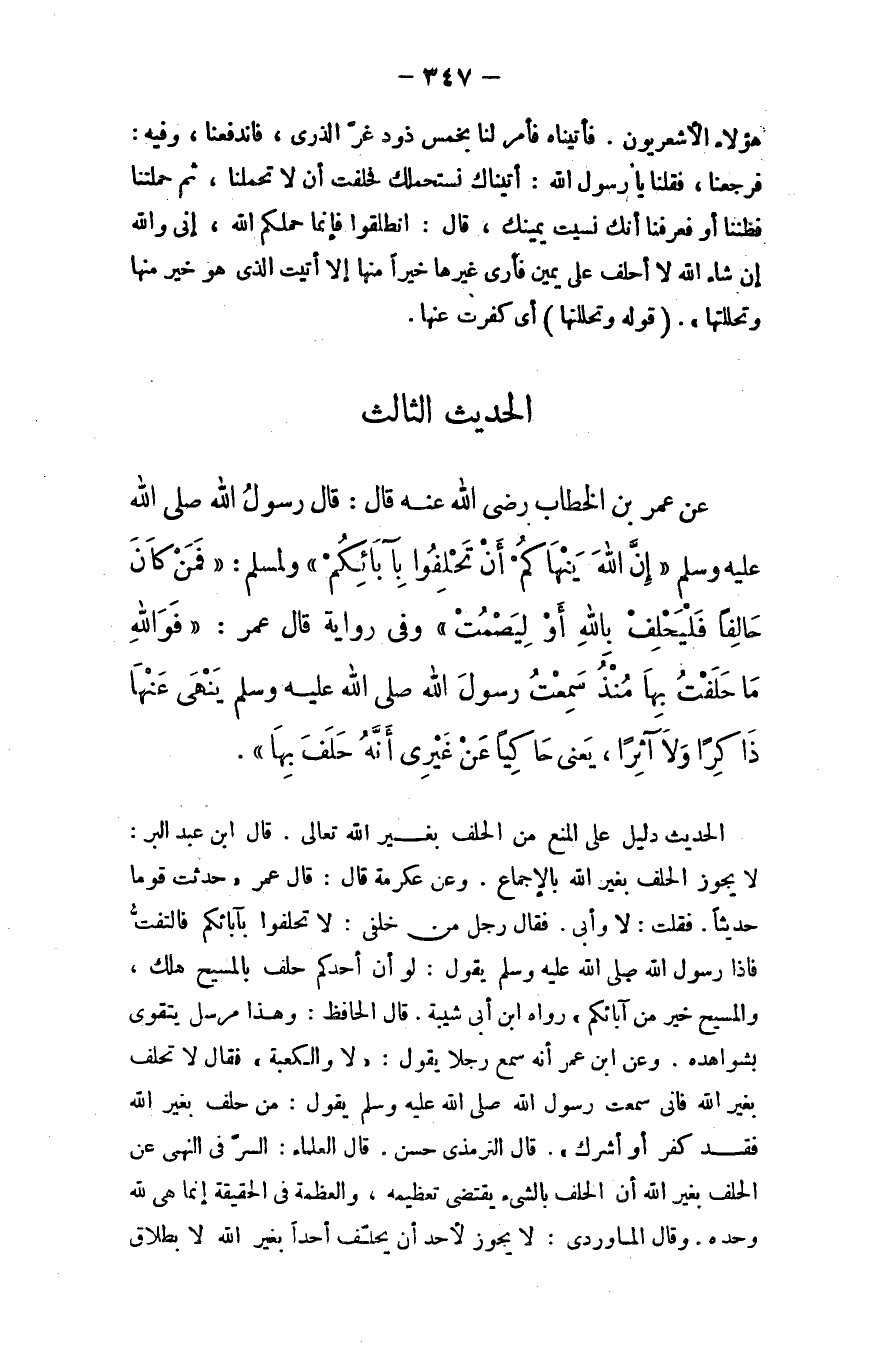 عن عمر بن الخطاب - رضي الله عنه - قال: قال رسول الله - صلى الله عليه وسلم -: ((إن الله ينهاكم أن تحلفوا بآبائكم)) ، ولمسلم: ((فمَن كان حالفًا فليحلف بالله أو ليصمت)) ، وفي رواية قال عمر: "فوالله ما حلفت بها منذ سمعت رسول الله - صلى الله عليه وسلم - ينهى عنها ذاكرًا ولا آثرًا"، يعني: حاكيًا أنه حلف بها.