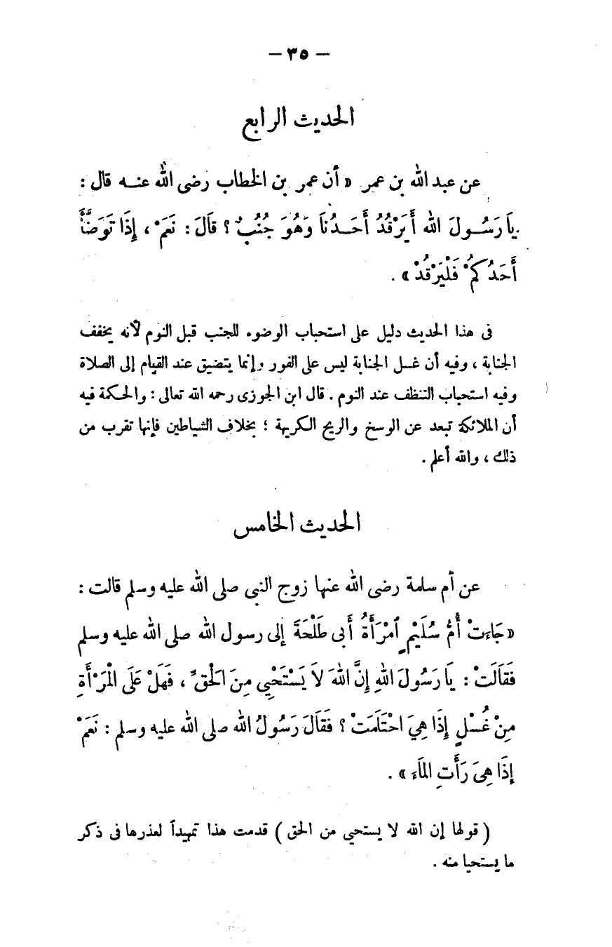 عن عبد الله بن عمر أن عمر بن الخطاب - رضي الله عنه - قال: يا رسول الله، أيرقد أحدنا وهو جنب؟ قال: ((نعم، إذا توضأ أحدكم فليرقد)) .