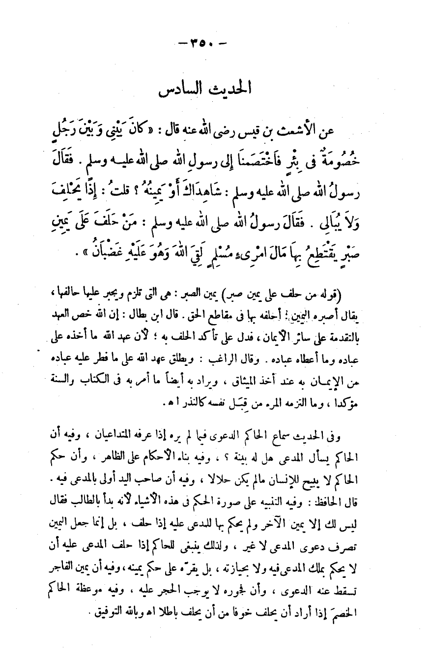 عن الأشعث بن قيس - رضي الله عنه - قال: "كان بيني وبين رجل خصومة في بئر فاختصمنا إلى رسول الله - صلى الله عليه وسلم - فقال رسول الله - صلى الله عليه وسلم -: ((شاهداك أو يمينه)) ، قلت: إذًا يحلف ولا يبالي، فقال رسول الله - صلى الله عليه وسلم -: ((مَن حلف على يمين صبرٍ يقتطع بها مال امرئ مسلم لقِي الله وهو عليه غضبان)) .