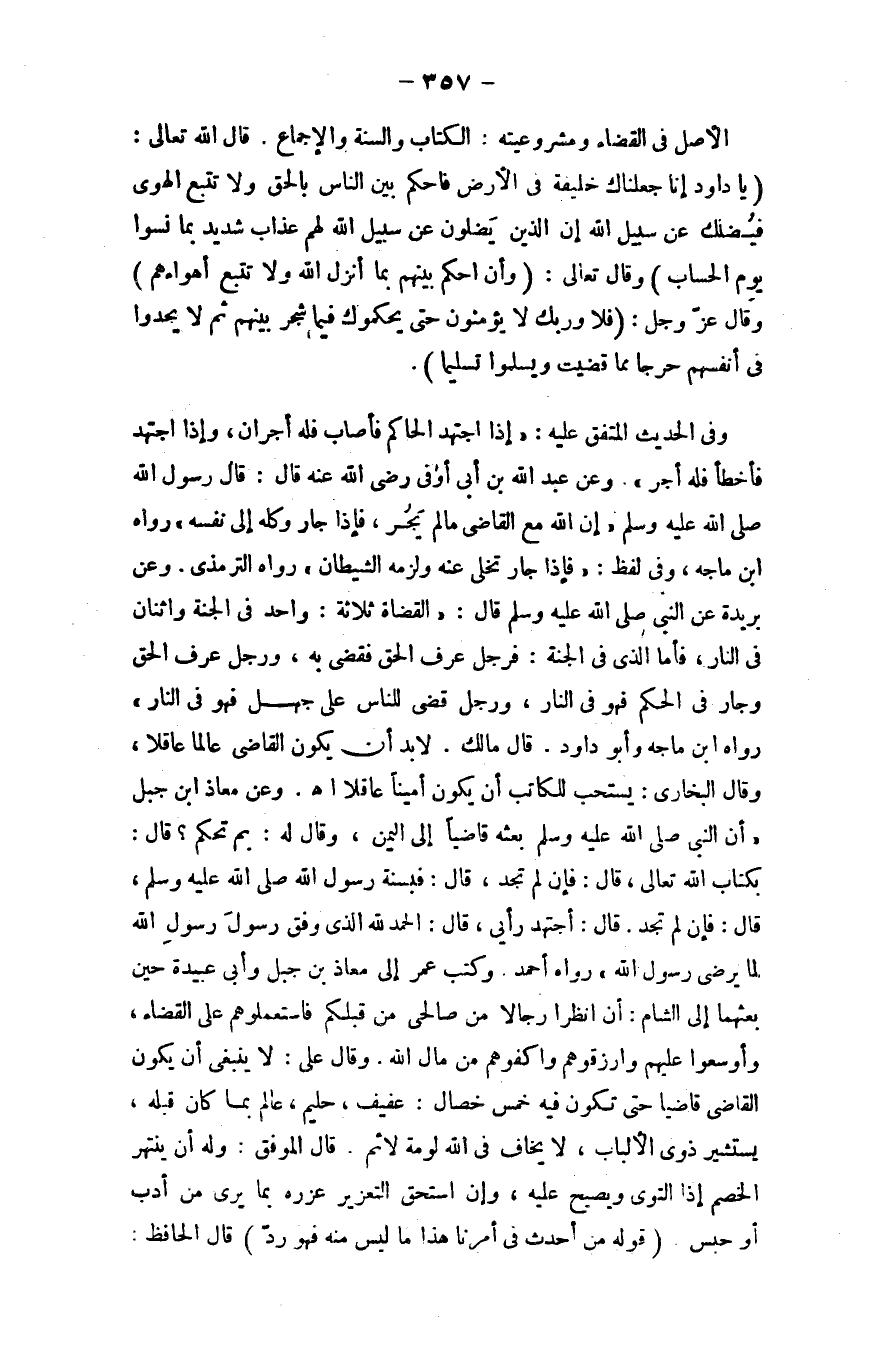 وكتب عمر إلى معاذ بن جبل وأبي عبيدة حين بعثهما إلى الشام: أن انظرَا رجالاً من صالحي مَن قِبَلَكم فاستعمِلوهم على القضاء، وأوسعوا عليهم وارزقوهم واكفُوهم من مال الله، وقال علي: لا ينبغي أن يكون القاضي قاضيًا حتى تكون فيه خمس خصال: عفيف، حليم، عالم بما كان قبله، يستشير ذوي الألباب، لا يخاف في الله لومة لائم.