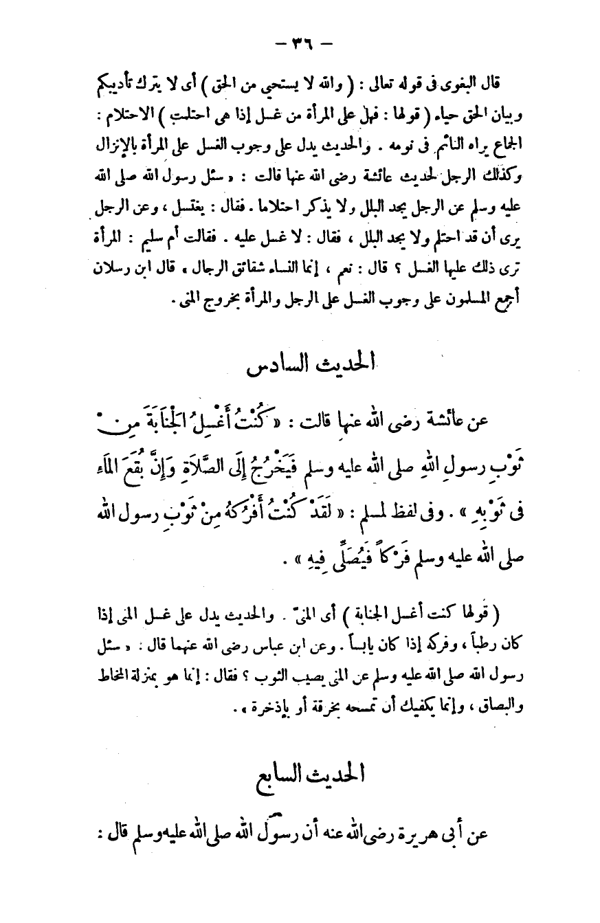 الغسل؟ قال: ((نعم، إنما النساء شقائق الرجال)) ، قال ابن رسلان: أجمَع المسلمون على وجوب الغسل على الرجل والمرأة بخروج المني.