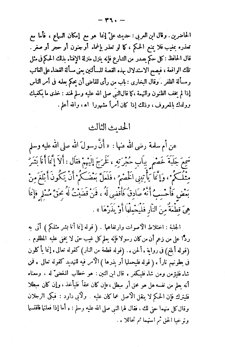 عن أم سلمة - رضي الله عنها -: أن رسول الله - صلى الله عليه وسلم - سمع جلبة خصم بباب حجرته، فخرج إليهم فقال: ((إلا إنما أنا بشر مثلكم، وإنما يأتيني الخصم، فلعلَّ بعضكم أن يكون أبلغ من بعض فأحسب أنه صادق فأقضي له، فمَن قضيتُ له بحقِّ مسلم فإنما هي قطعة من النار فليحملها أو يذرها)) .