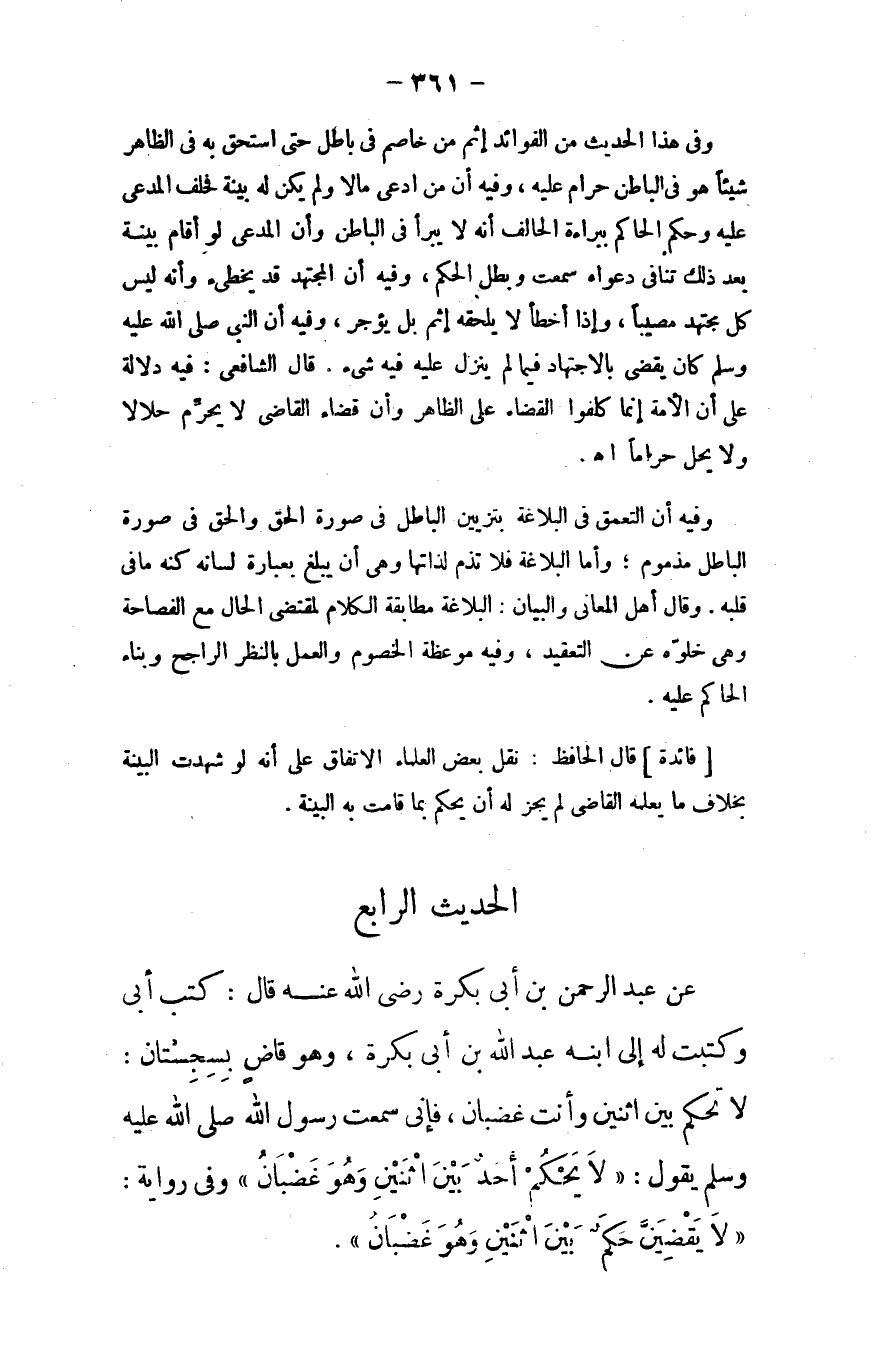 عن عبد الرحمن بن أبي بكرة - رضي الله عنه - قال: كتب أبي وكتبت له إلى ابنه عبد الله بن أبي بكرة، وهو قاضٍ بسجستان: لا تحكم بين اثنين وأنت غضبان، فإني سمعت رسول الله - صلى الله عليه وسلم - يقول: ((لا يحكم أحد بين اثنين وهو غضبان)) ، وفي رواية: ((لا يقضين حكم بين اثنين وهو غضبان)) .