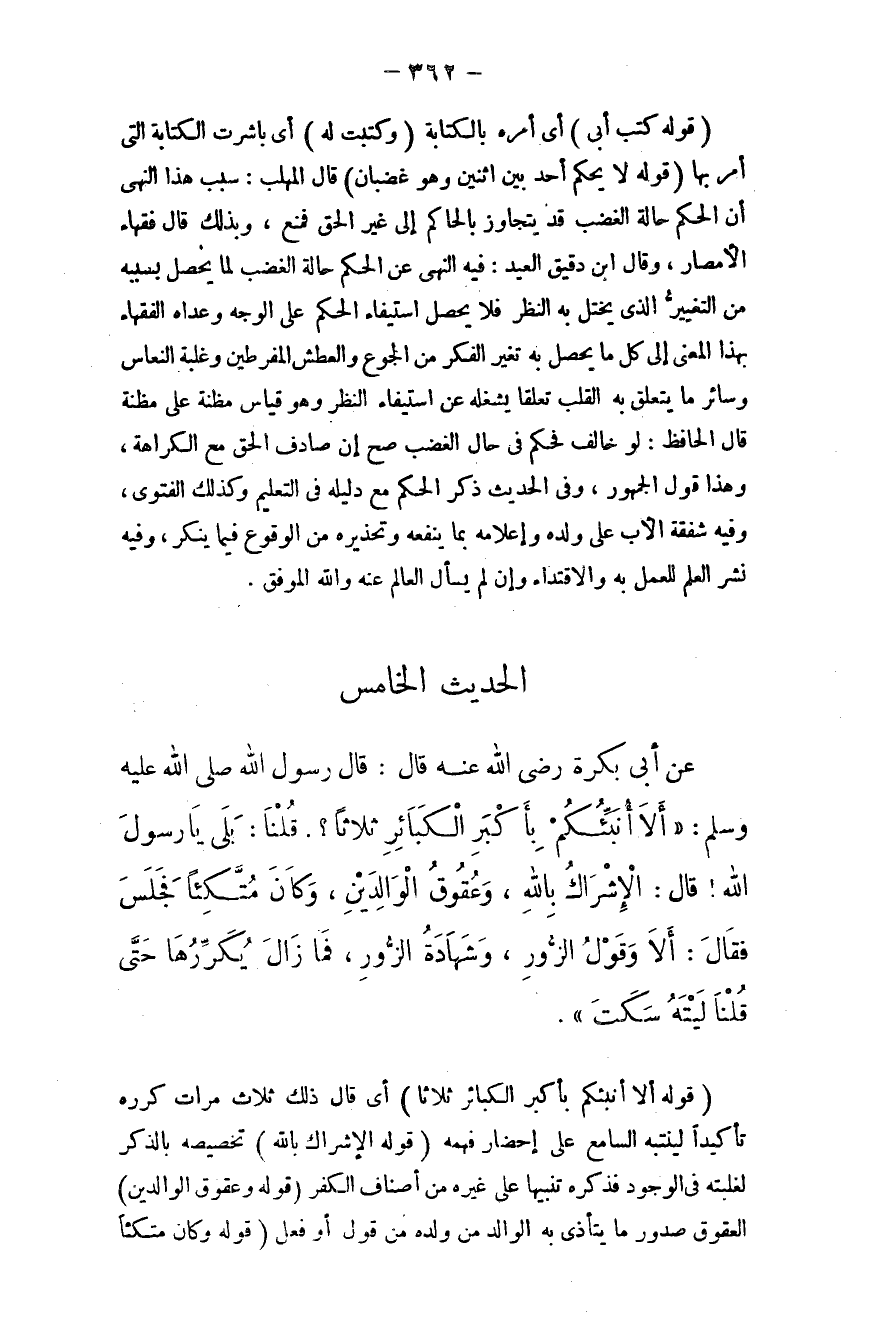 عن أبي بكرة - رضي الله عنه - قال: قال رسول الله - صلى الله عليه وسلم -: ((ألاَ أنبكم بأكبر الكبائر؟)) ثلاثًا، قلنا: بلى يا رسول الله، قال: ((الإشراك بالله، وعقوق الوالدين)) ، وكان متكئًا فجلس فقال: ((ألاَ وقول الزور، وشهادة الزور)) ، فما زال يكررها حتى قلنا: ليته سكت.