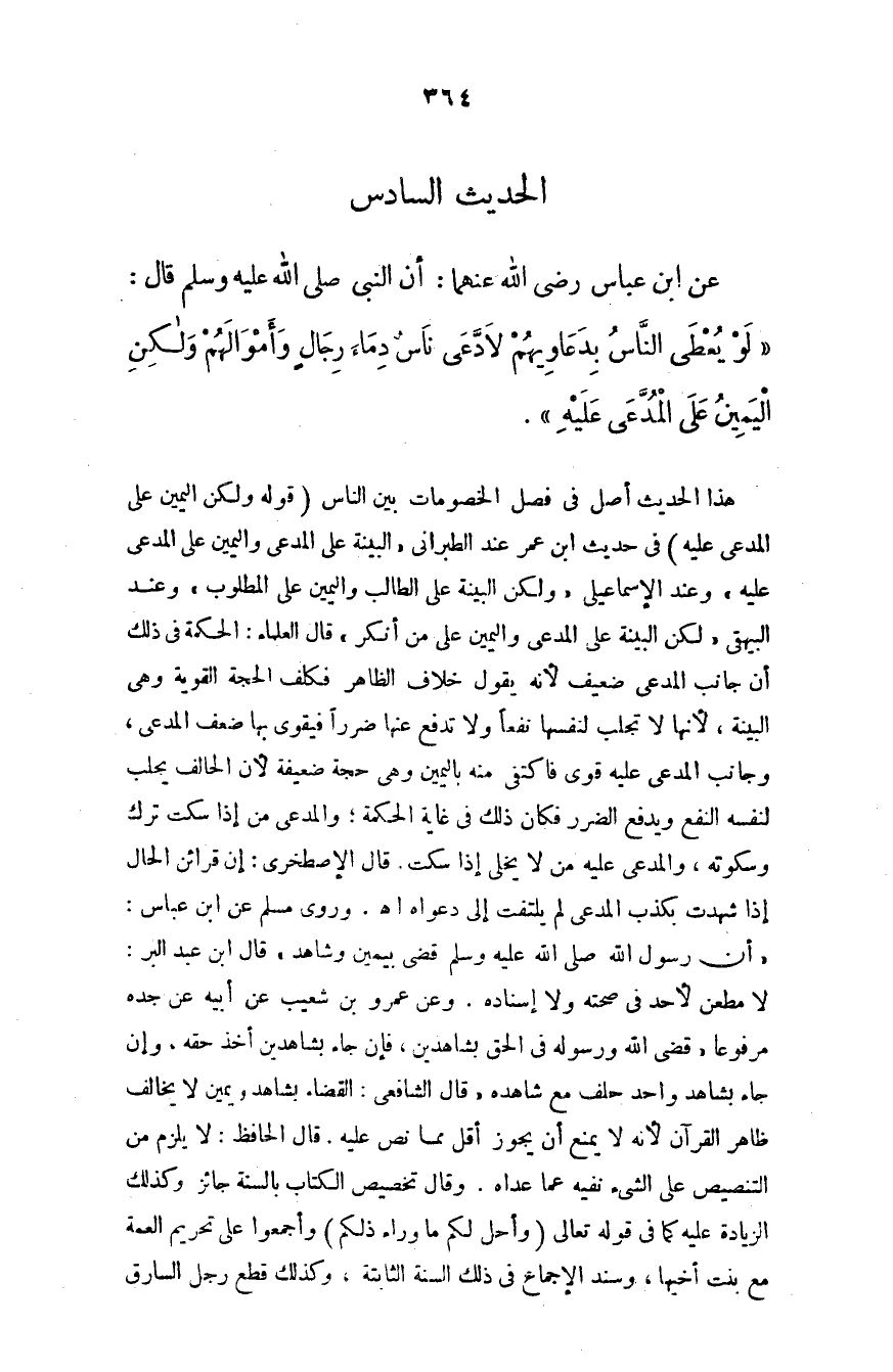 عن ابن عباس - رضي الله عنهما -: أن النبي - صلى الله عليه وسلم - قال: ((لو يعطى الناس بدعاويهم لادَّعى ناس دماء رجالٍ وأموالهم ولكن اليمين على المدَّعى عليه)) .