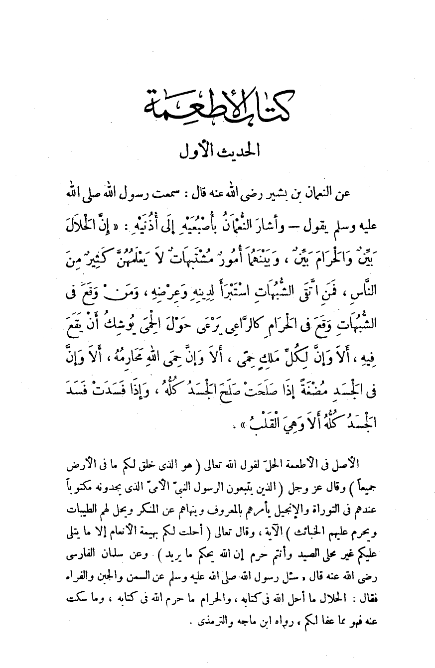 عن النعمان بن بشير - رضي الله عنه - قال: سمعت رسول الله - صلى الله عليه وسلم - يقول - وأشار النعمان بأصبعيه إلى أذنيه -: ((إن الحلال بيِّن والحرام بيِّن، وبينهما أمور مشتبهات لا يعلمهن كثيرٌ من الناس، فمَن اتَّقى الشبهات استبرأ لدينه وعرضه، ومَن وقع في الشبهات وقع في الحرام؛ كالراعي يرعى حول الحِمَى يوشك أن يقع فيه، ألاَ وإن لكل ملك حِمَى، ألاَ وأن حِمَى الله محارمه، ألاَ وإن في الجسد مضغة إذا صلحت صلح الجسد كلُّه، وإذا فسدت فسد الجسد كله، ألاَ وهي القلب)) .