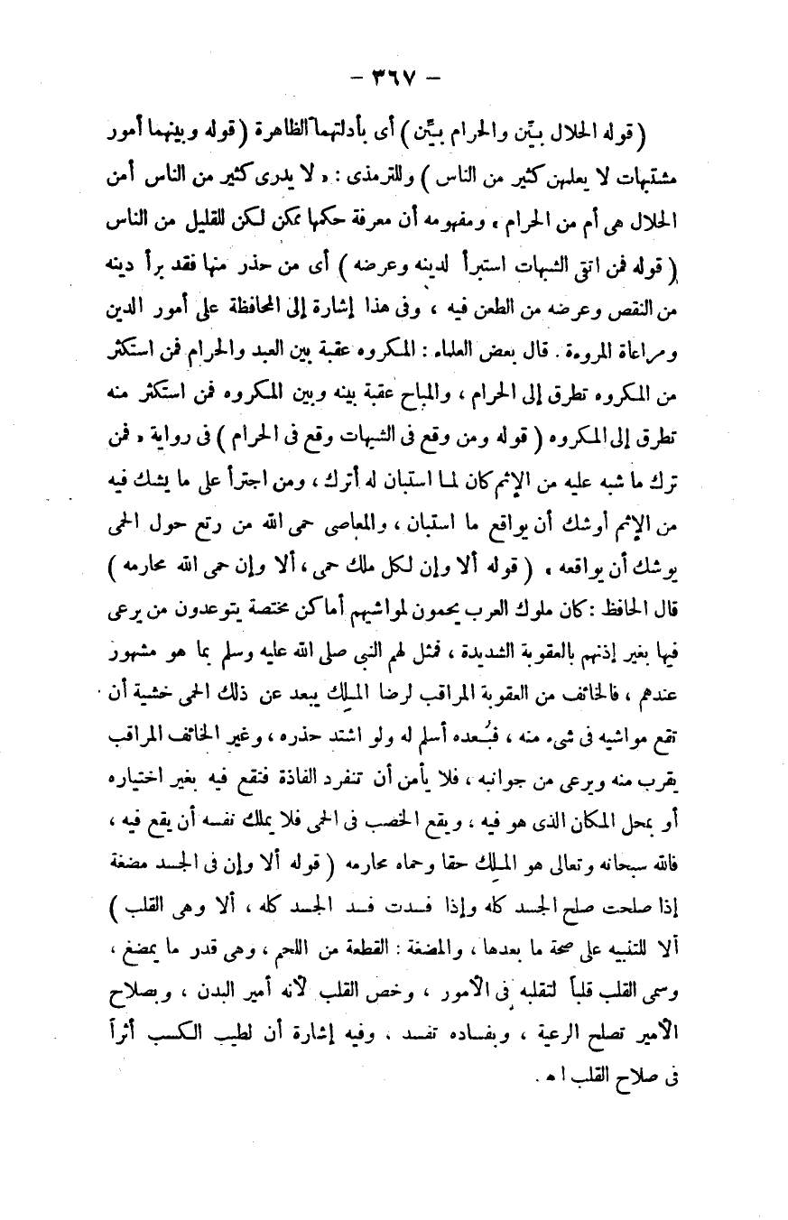 قوله: ((ألاَ وإن لكل ملك حِمَى، ألاَ وإن حِمَى الله محارمه)) قال الحافظ: كان ملوك العرب يحمون لمواشيهم أماكن مختصَّة يتوعَّدون مَن يرعى فيها بغير إذنهم بالعقوبة الشديدة، فمثَّل لهم النبي - صلى الله عليه وسلم - بما هو مشهور عندهم، فالخائف من العقوبة المراقب لرضا الملك يبعد عن ذلك الحمى؛ خشية أن تقع مواشيه في شيء منه، فبعده أسلم له ولو اشتدَّ حذره، وغير الخائف المراقب يقرب منه ويرعى من جوانبه، فلا يأمن أن تنفرد الفاذة فتقع فيه بغير اختياره أو بمحلِّ المكان الذي هو فيه، ويقع الخصب في الحمى فلا يملك نفسه أن يقع فيه، فالله - سبحانه وتعالى - هو الملك حقًّا وحماه محارمه.