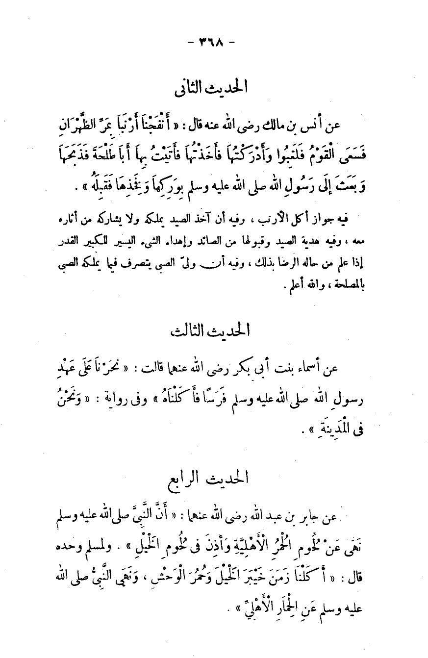 عن جابر بن عبد الله - رضي الله عنهما -: "أن النبي - صلى الله عليه وسلم - نهى عن لحوم الحمر الأهلية وأَذِن في لحوم الخيل"، ولمسلم وحده قال: "أكلنا زمن خيبر الخيل وحمر الوحش، ونهى النبي - صلى الله عليه وسلم - عن الحمار الأهلي".