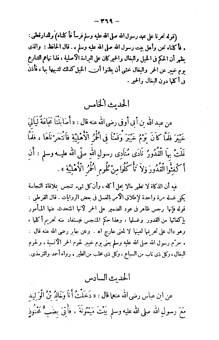 عن عبد الله بن أبي أوفى - رضي الله عنه - قال: "أصابتنا مجاعة ليالي خيبر فلمَّا كان يوم خيبر وقعنا في الحمر الأهلية فانتحرناها، فلمَّا غلت بها القدور نادَى منادي رسول الله - صلى الله عليه وسلم -: أن أكفِئُوا القدور، ولا تأكلوا من لحوم الحمر الأهلية".