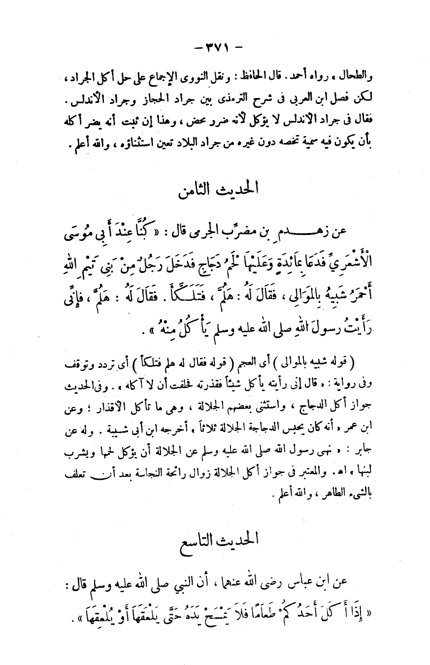 قال الحافظ: ونقل النووي الإجماع على حلِّ أكل الجراد، لكن فصَّل ابن العربي في شرح الترمذي بين جراد الحجاز وجراد الأندلس؛ فقال في جراد الأندلس: لا يؤكل؛ لأنه ضرر محض، وهذا إن ثبت أنه يضرُّ أكله بأن يكون فيه سمية تخصُّه دون غيره من جراد البلاد تعيَّن استثناؤه، والله اعلم.