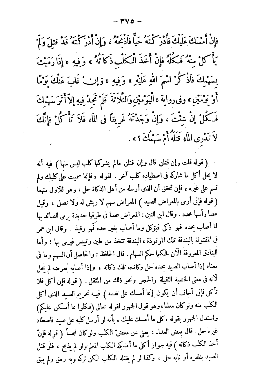 قال الحافظ: والحاصل أن السهم وما في معناه إذا أصاب الصيد بحدِّه حل وكانت تلك ذكاته، وإذا أصابه بعرضه لم يحلَّ؛ لأنه في معنى الخشبة الثقيلة والحجر ونحو ذلك من المثقل.