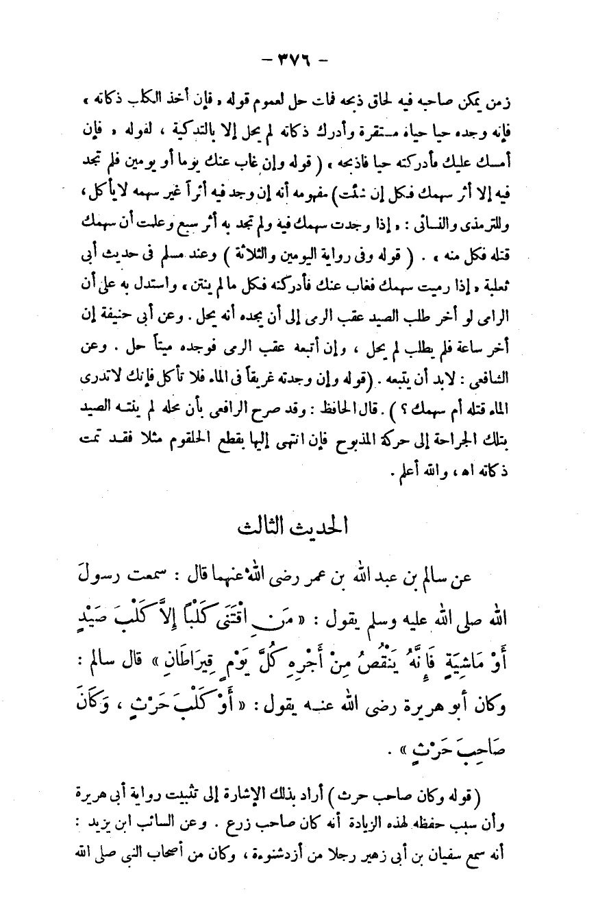 عن سالم بن عبد الله بن عمر - رضي الله عنهما - قال: سمعت رسول الله - صلى الله عليه وسلم - يقول: ((مَن اقتنى كلبًا إلا كلب صيد أو ماشية فإنه ينقص من أجره كل يوم قيراطان)) ، قال سالم: "وكان أبو هريرة - رضي الله عنه - يقول: أو كلب حرثٍ، وكان صاحب حرثٍ".