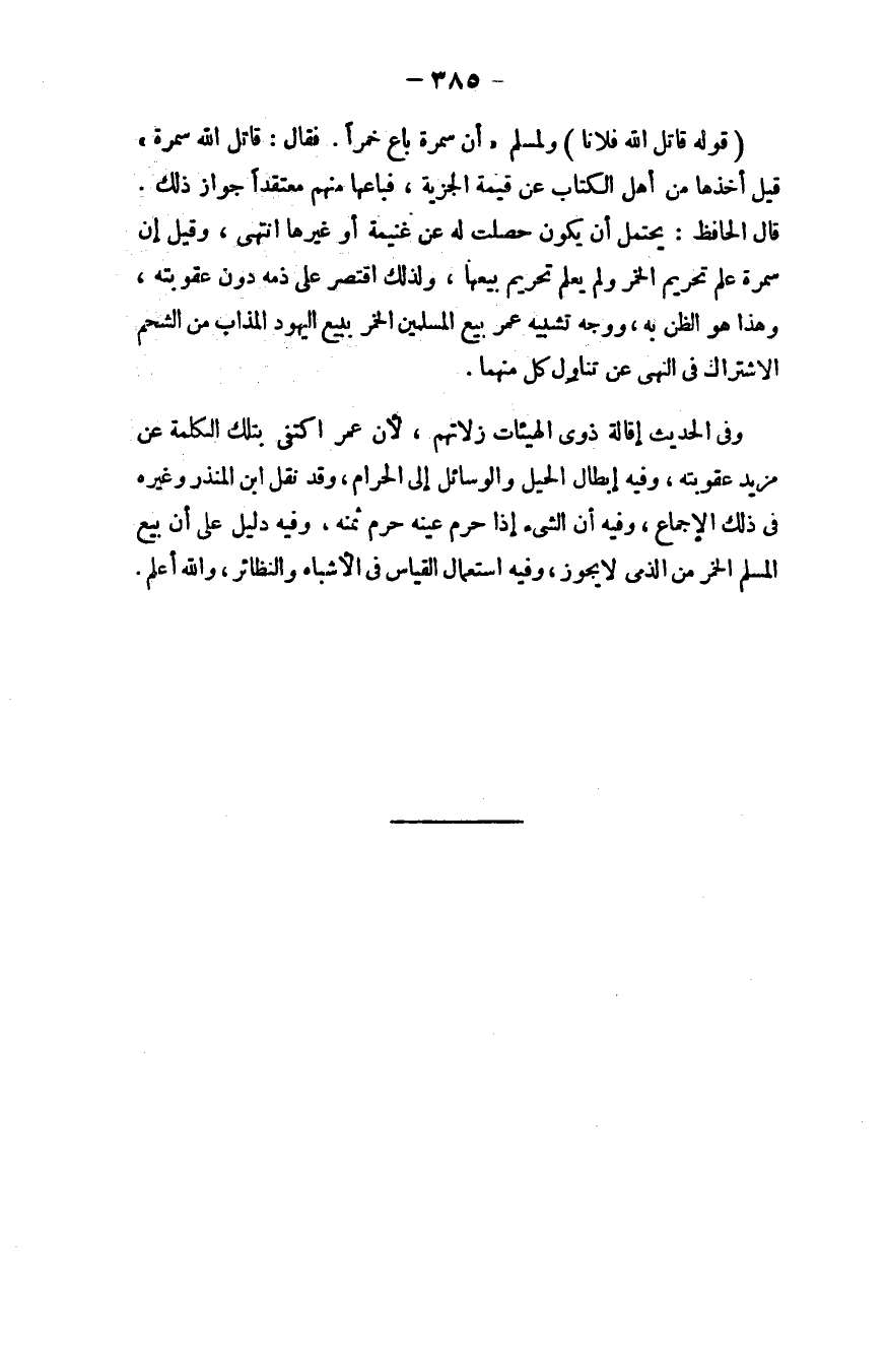 قوله: "قاتل الله فلانًا"، ولمسلم: أن سمرة باع خمرًا، فقال: قاتل الله سمرة، قيل: أخذها من أهل الكتاب عن قيمة الجزية، فباعها منهم معتقدًا جواز ذلك، قال الحافظ: يحتمل أن يكون حصلت له عن غنيمة أو غيرها، انتهى.