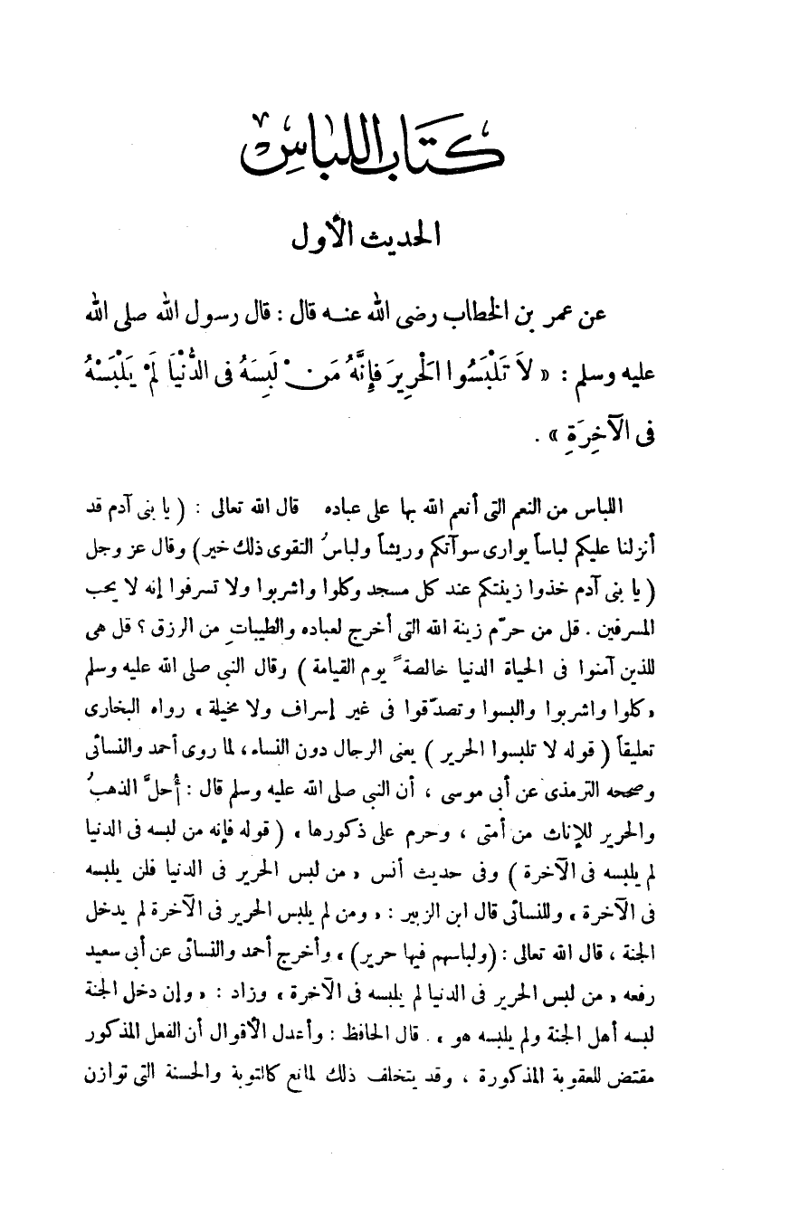 عن عمر بن الخطاب - رضي الله عنه - قال: قال رسول الله - صلى الله عليه وسلم -: ((لا تلبسوا الحرير فإنه مَن لبسه في الدنيا لم يلبسه في الآخرة)) .