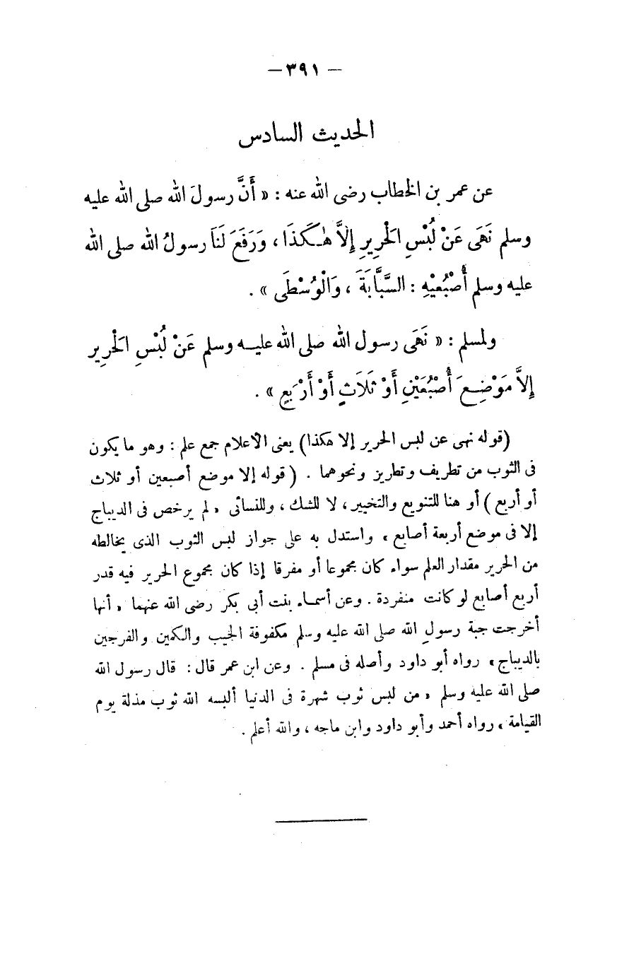 عن عمر بن الخطاب - رضي الله عنه -: "أن رسول الله - صلى الله عليه وسلم - نهى عن لبس الحرير إلا هكذا، ورفع لنا رسول الله - صلى الله عليه وسلم - أصبعيه: السبابة، والوسطى".