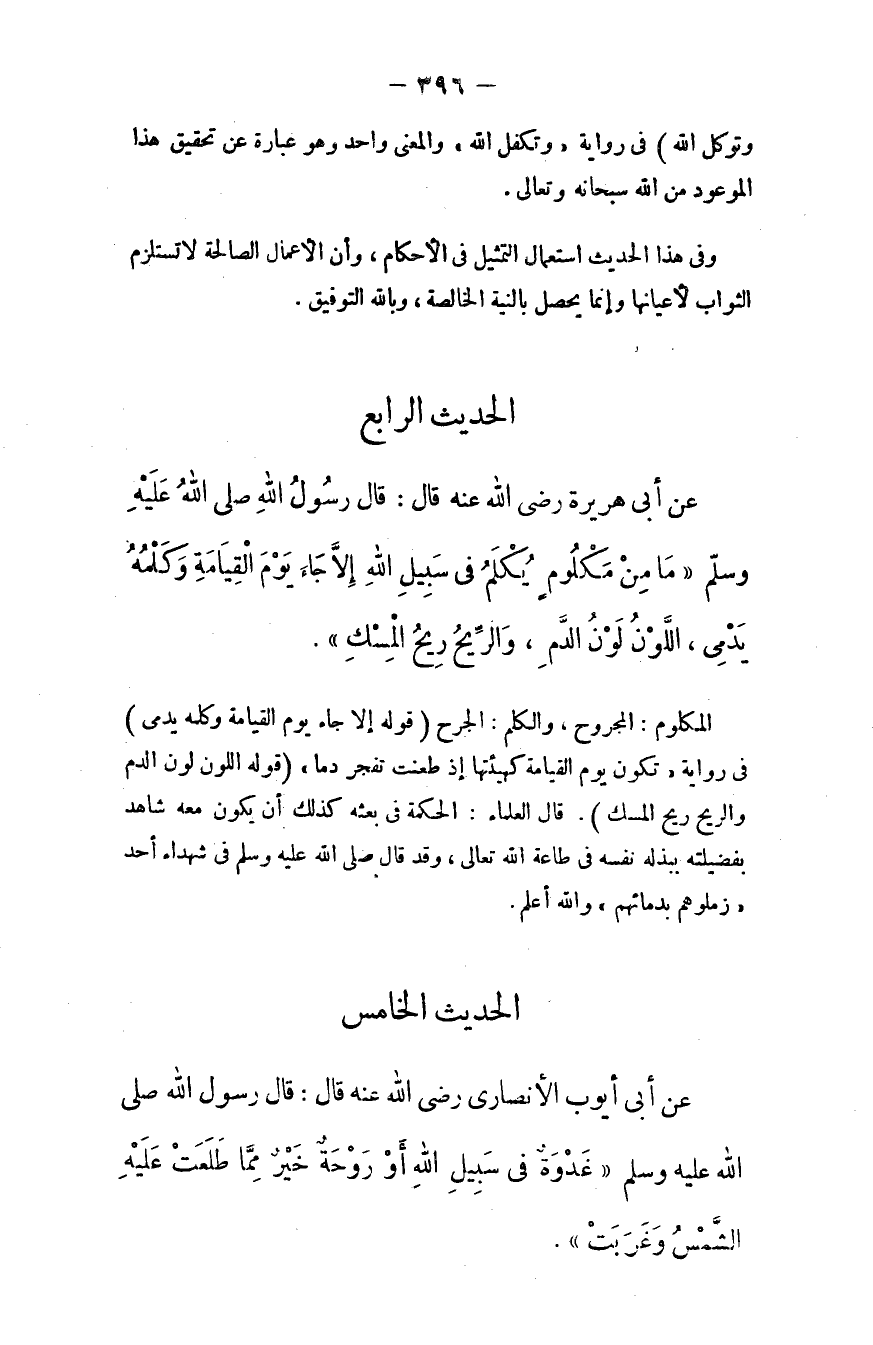 عن أبي هريرة - رضي الله عنه - قال: قال رسول الله - صلى الله عليه وسلم -: ((ما من مكلوم يُكلَم في سبيل الله إلا جاء يوم القيامة وكلمه يدمي، اللون لون الدم، والريح ريح المسك)) .