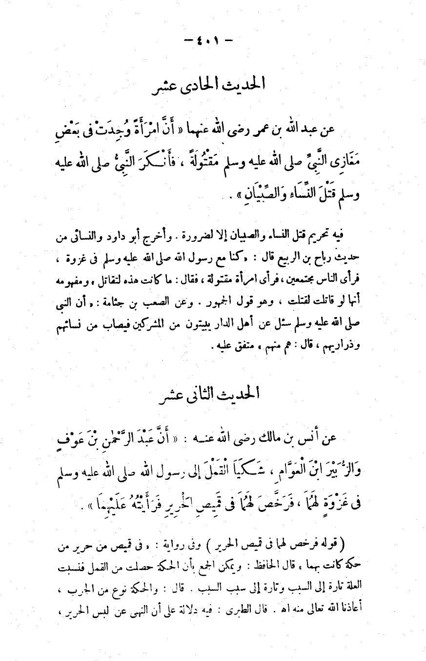 عن عبد الله بن عمر - رضي الله عنهما -: "أن امرأة وُجِدت في بعض مغازي النبي - صلى الله عليه وسلم - مقتولة، فأنكر النبي - صلى الله عليه وسلم - قتل النساء والصبيان".