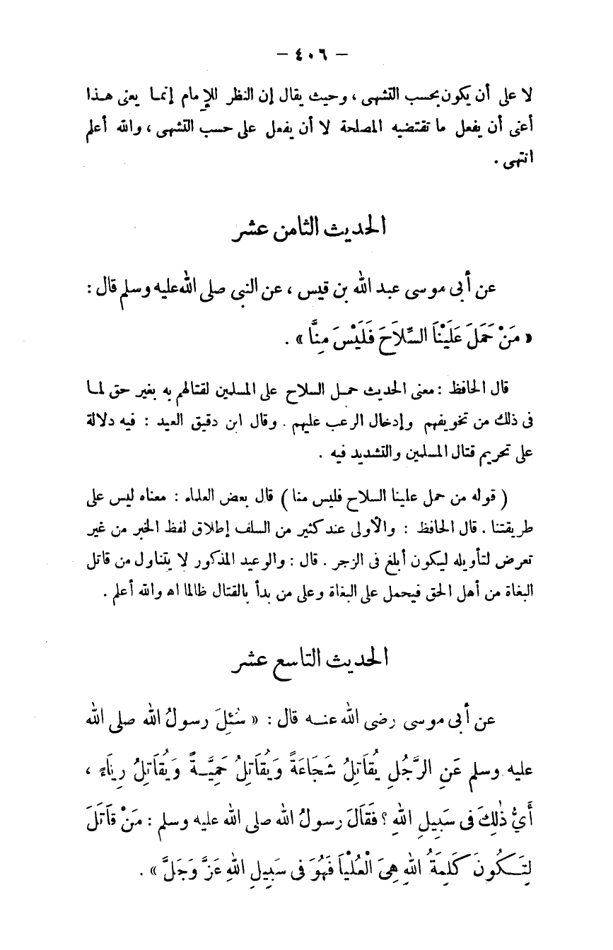 عن أبي موسى - رضي الله عنه - قال: "سُئِل رسول الله - صلى الله عليه وسلم - عن الرجل يقاتل شجاعة ويقاتل حمية ويقاتل رياء، أيُّ ذلك في سبيل الله؟ فقال رسول الله - صلى الله عليه وسلم -: ((مَن قاتل لتكون كلمة الله هي العليا فهو في سبيل الله - عزَّ وجلَّ)) .