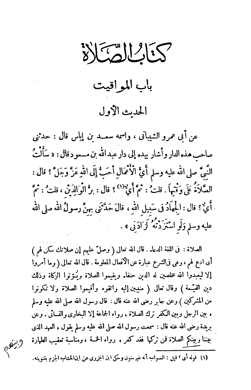 عن أبي عمرو الشيباني - واسمه سعد بن إياس - قال: حدثني صاحب هذه الدار - وأشار بيده إلى دار عبد الله بن مسعود - قال: "سألت النبي - صلى الله عليه وسلم -: أيُّ الأعمال أحبُّ إلى الله - عزَّ وجلَّ -؟ قال: ((الصلاة على وقتها)) ، قلت: ثم أي (¬1) ؟ قال: ((بر الوالدين)) ، قلت: ثم أي؟ قال: ((الجهاد في سبيل الله)) ، قال: حدثني بهن رسول الله - صلى الله عليه وسلم - ولو استزدته لزادني.